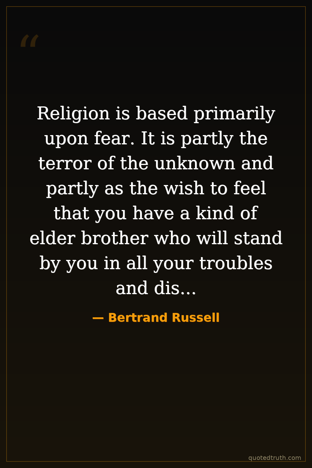 Religion is based primarily upon fear. It is partly the terror of the unknown and partly as the wish to feel that you have a kind of elder brother who will stand by you in all your troubles and disputes. Fear of the mysterious, fear of defeat, fear of death. Fear is the parent of cruelty, and therefore it is no wonder if cruelty and religion have gone hand in hand.