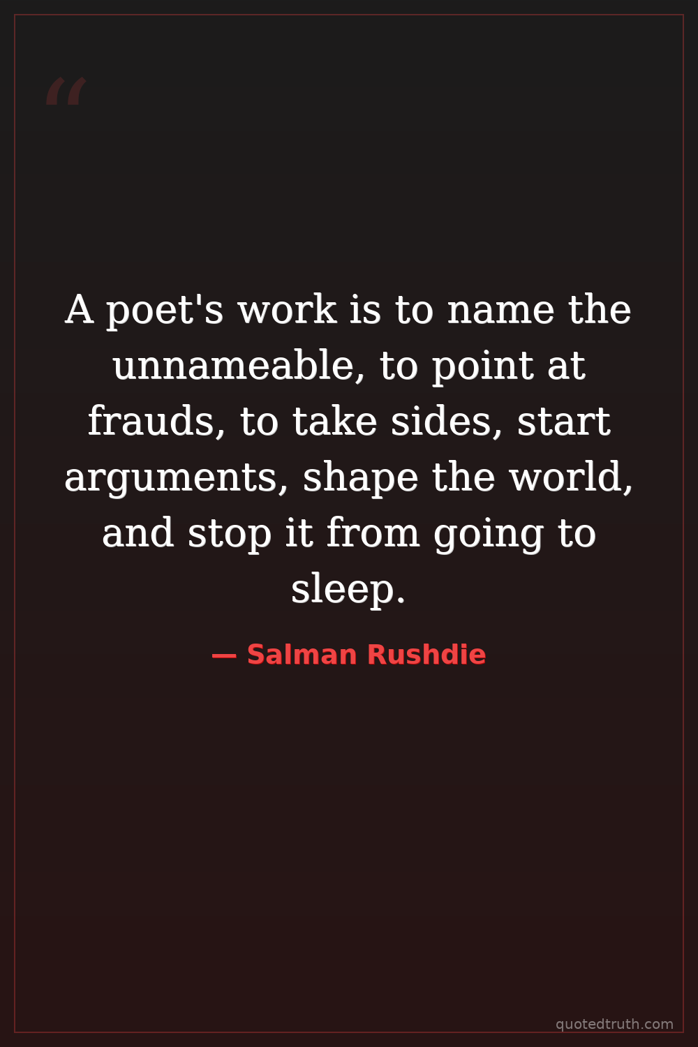 A poet's work is to name the unnameable, to point at frauds, to take sides, start arguments, shape the world, and stop it from going to sleep.