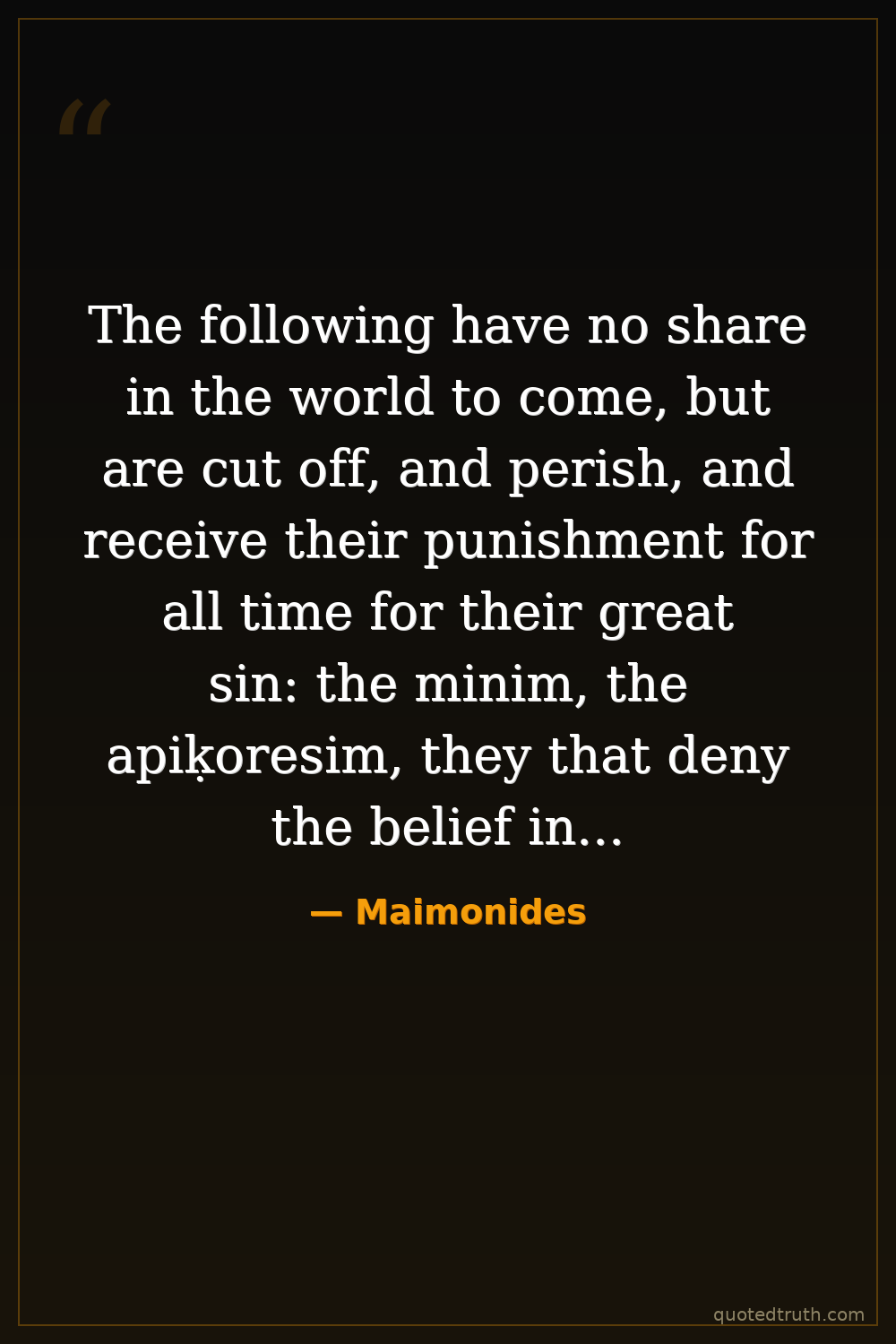 The following have no share in the world to come, but are cut off, and perish, and receive their punishment for all time for their great sin: the minim, the apiḳoresim, they that deny the belief in the Torah, they that deny the belief in resurrection of the dead and in the coming of the Redeemer, the apostates, they that lead many to sin, they that turn away from the ways of the [Jewish] community...