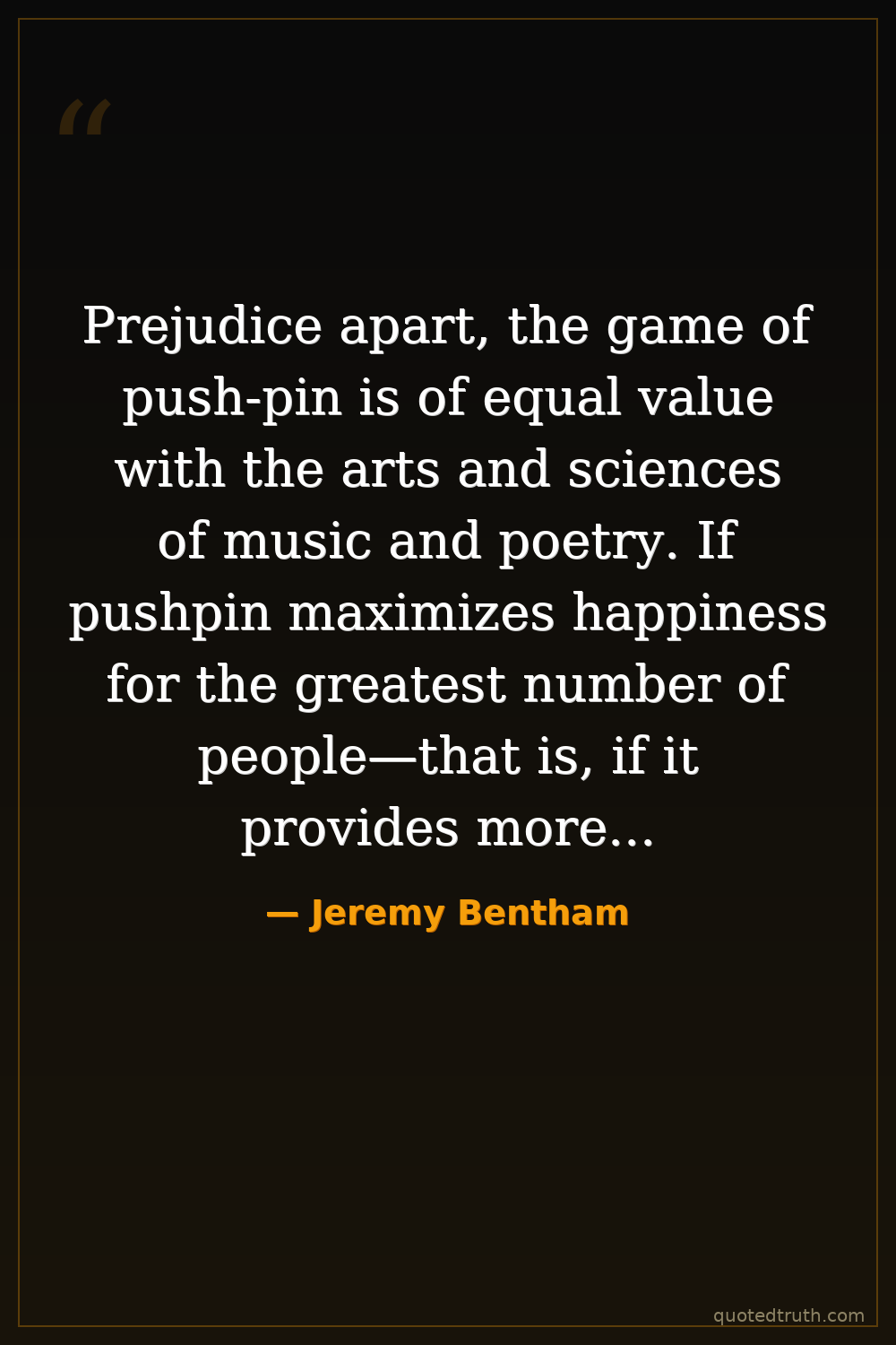 Prejudice apart, the game of push-pin is of equal value with the arts and sciences of music and poetry. If pushpin maximizes happiness for the greatest number of people—that is, if it provides more pleasure than either music or poetry—then, he reasons, it is more valuable than art.