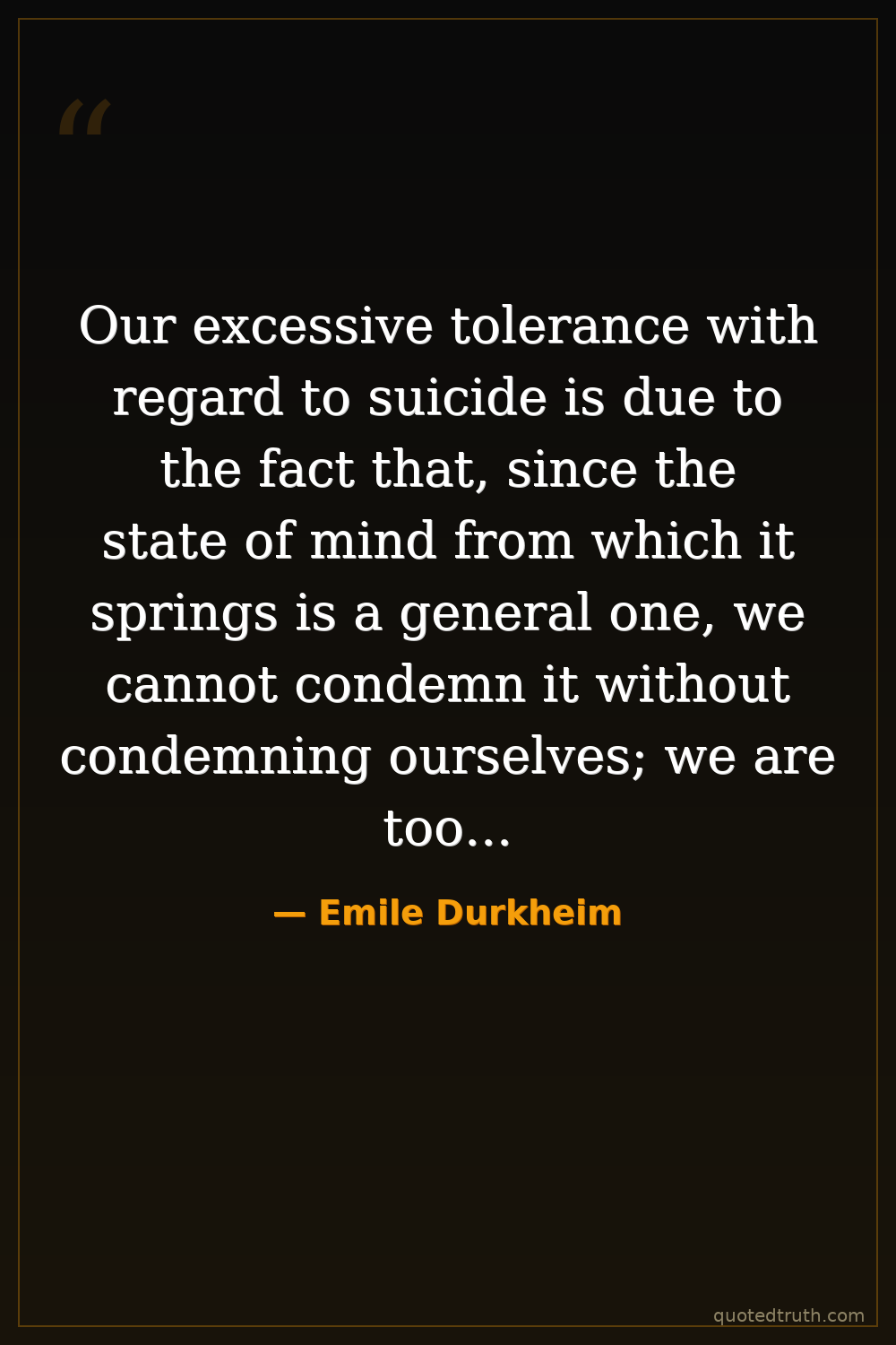 Our excessive tolerance with regard to suicide is due to the fact that, since the state of mind from which it springs is a general one, we cannot condemn it without condemning ourselves; we are too saturated with it not partly to excuse it.