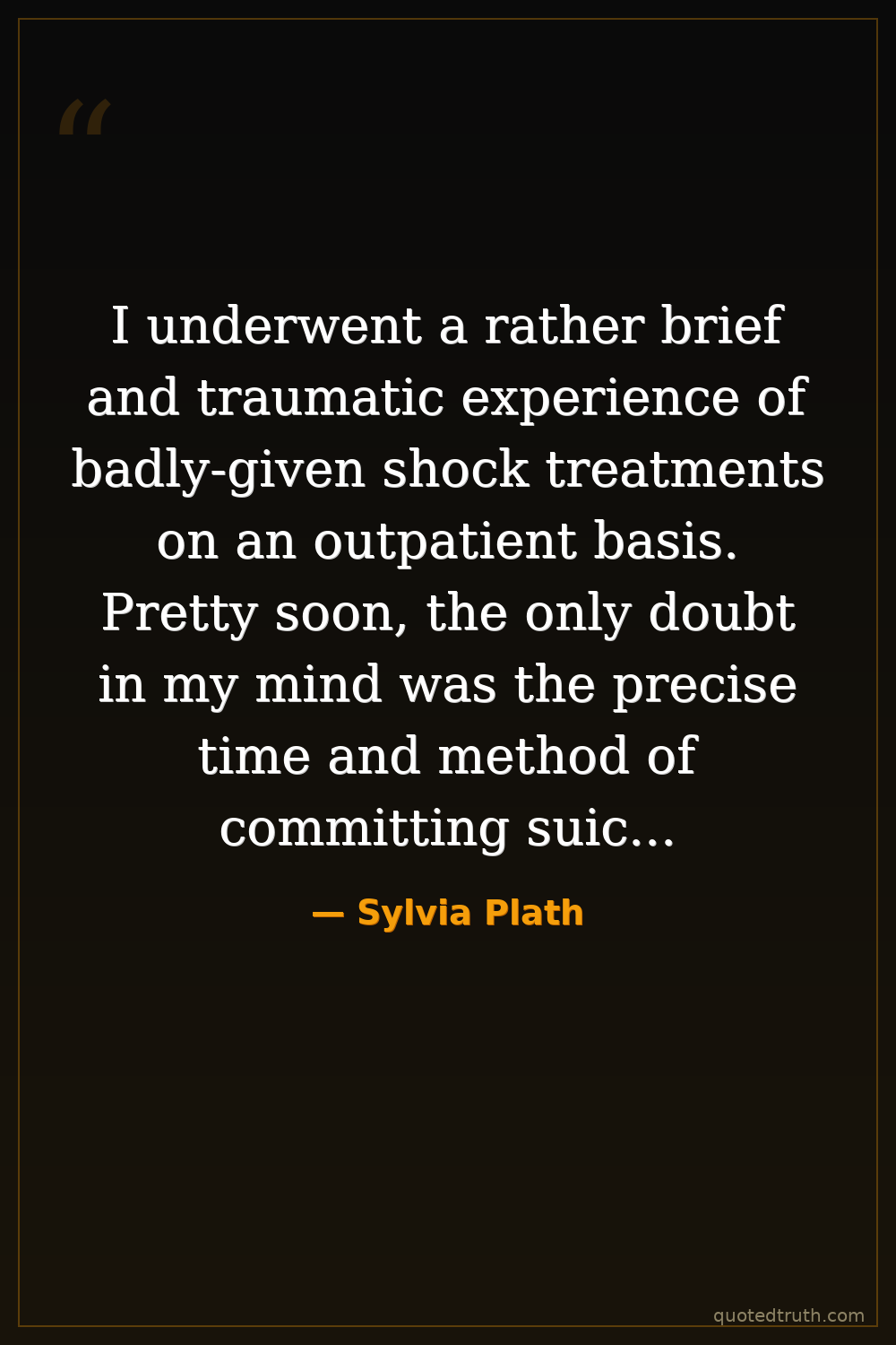I underwent a rather brief and traumatic experience of badly-given shock treatments on an outpatient basis. Pretty soon, the only doubt in my mind was the precise time and method of committing suicide.