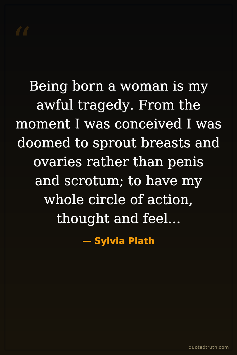 Being born a woman is my awful tragedy. From the moment I was conceived I was doomed to sprout breasts and ovaries rather than penis and scrotum; to have my whole circle of action, thought and feeling rigidly circumscribed by my inescapable feminity.