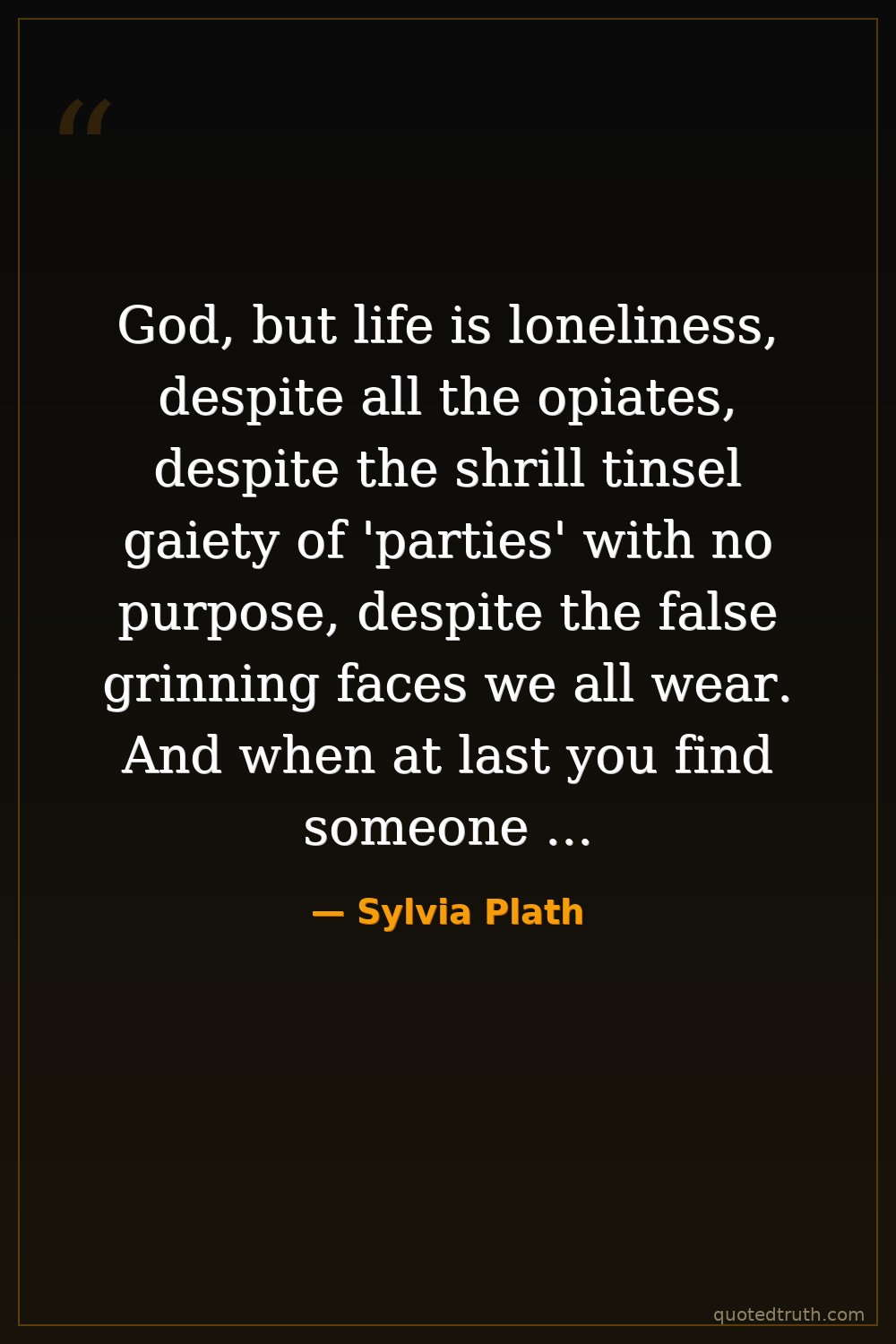 God, but life is loneliness, despite all the opiates, despite the shrill tinsel gaiety of 'parties' with no purpose, despite the false grinning faces we all wear. And when at last you find someone to whom you feel you can pour out your soul, you stop in shock at the words you utter – they are so rusty, so ugly, so meaningless and feeble from being kept in the small cramped dark inside you so long.