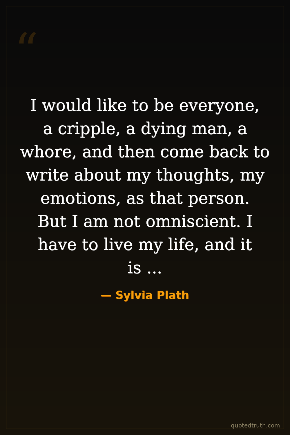 I would like to be everyone, a cripple, a dying man, a whore, and then come back to write about my thoughts, my emotions, as that person. But I am not omniscient. I have to live my life, and it is the only one I'll ever have. And you cannot regard your own life with objective curiosity all the time.