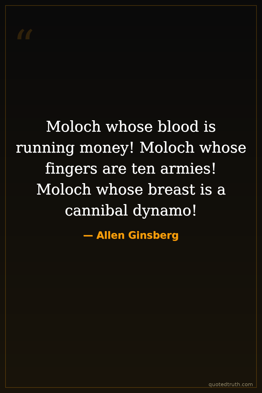 Moloch whose blood is running money! Moloch whose fingers are ten armies! Moloch whose breast is a cannibal dynamo!