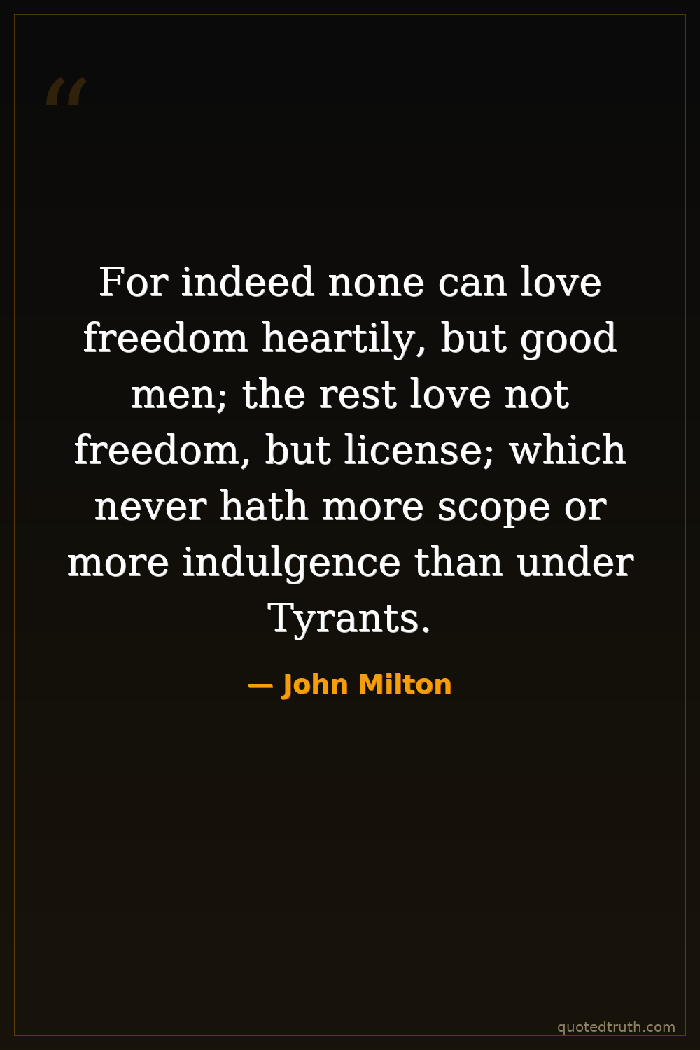For indeed none can love freedom heartily, but good men; the rest love not freedom, but license; which never hath more scope or more indulgence than under Tyrants.