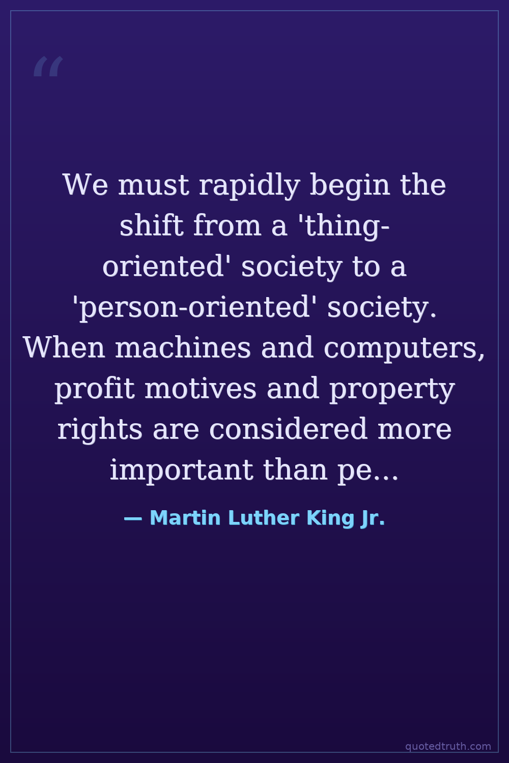 We must rapidly begin the shift from a 'thing-oriented' society to a 'person-oriented' society. When machines and computers, profit motives and property rights are considered more important than people, the giant triplets of racism, materialism, and militarism are incapable of being conquered.