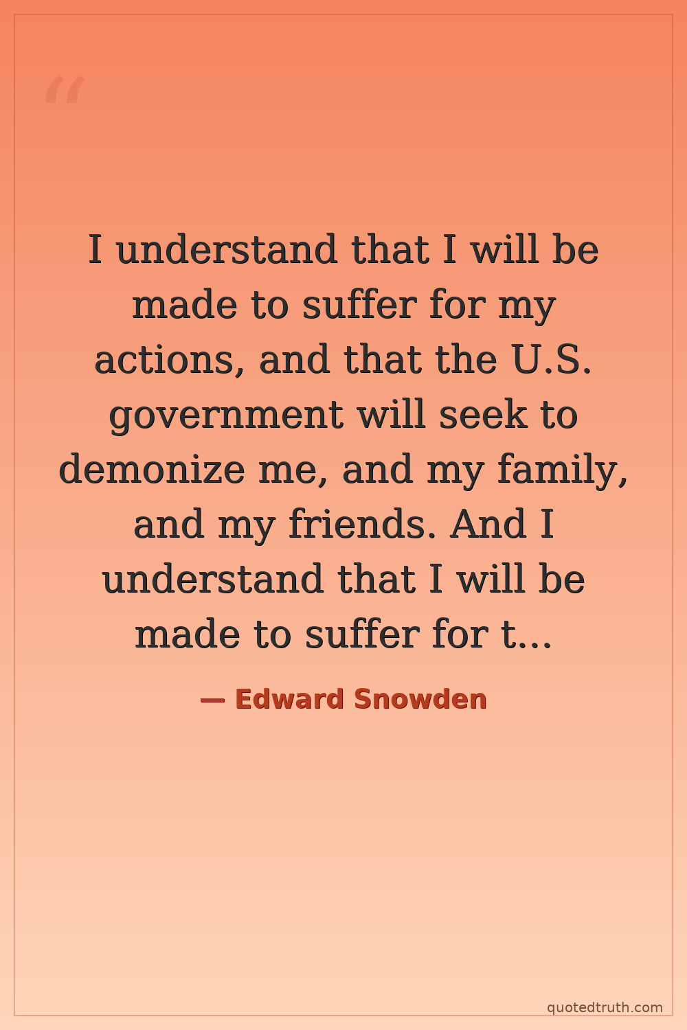 I understand that I will be made to suffer for my actions, and that the U.S. government will seek to demonize me, and my family, and my friends. And I understand that I will be made to suffer for this. But I'm willing to accept that. — Edward Snowden Contemporary NSA whistleblower