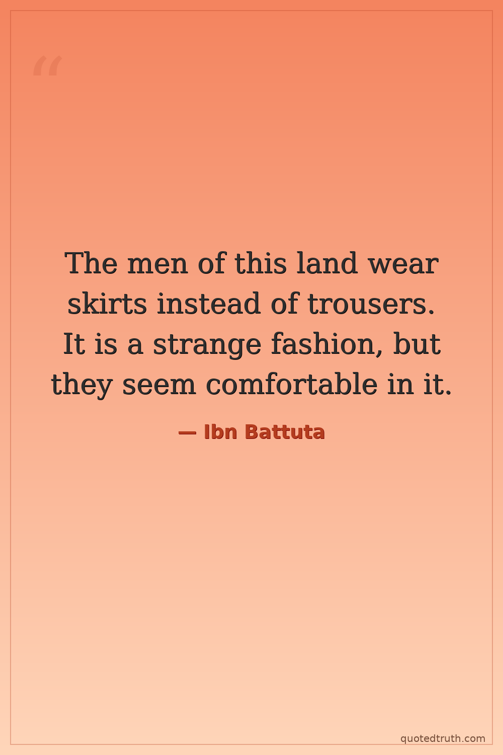 The men of this land wear skirts instead of trousers. It is a strange fashion, but they seem comfortable in it.