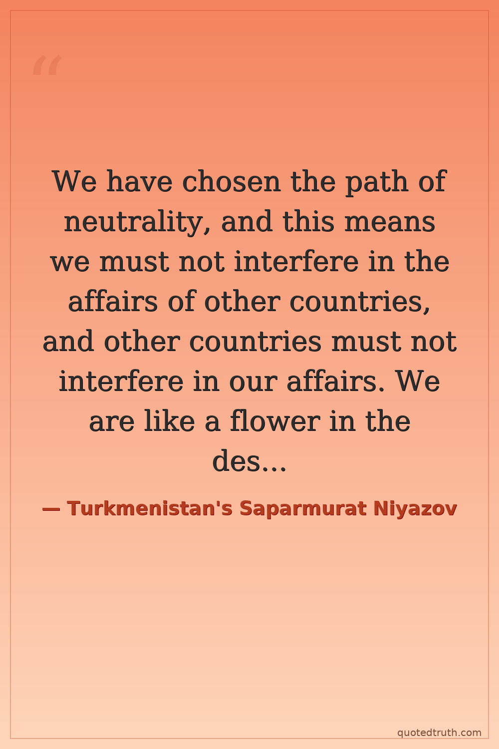 We have chosen the path of neutrality, and this means we must not interfere in the affairs of other countries, and other countries must not interfere in our affairs. We are like a flower in the desert, beautiful and alone. — Turkmenistan's Saparmurat Niyazov Contemporary Renamed months after himself