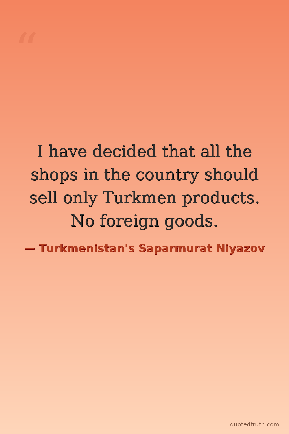 I have decided that all the shops in the country should sell only Turkmen products. No foreign goods.