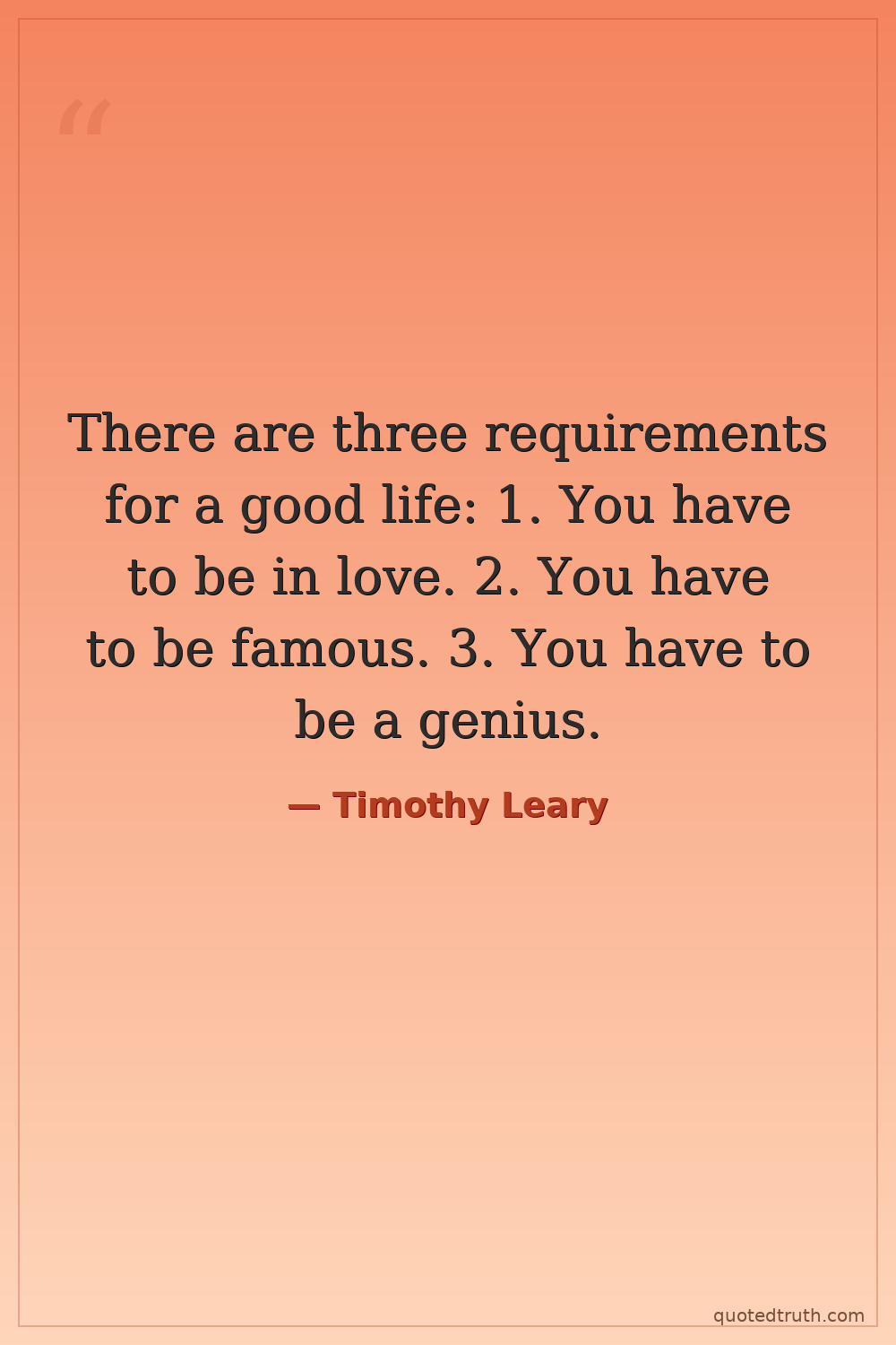 There are three requirements for a good life: 1. You have to be in love. 2. You have to be famous. 3. You have to be a genius.