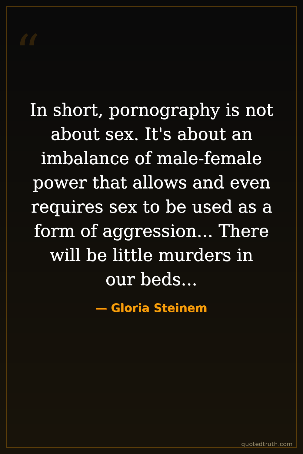 In short, pornography is not about sex. It's about an imbalance of male-female power that allows and even requires sex to be used as a form of aggression... There will be little murders in our beds - and very little love.
