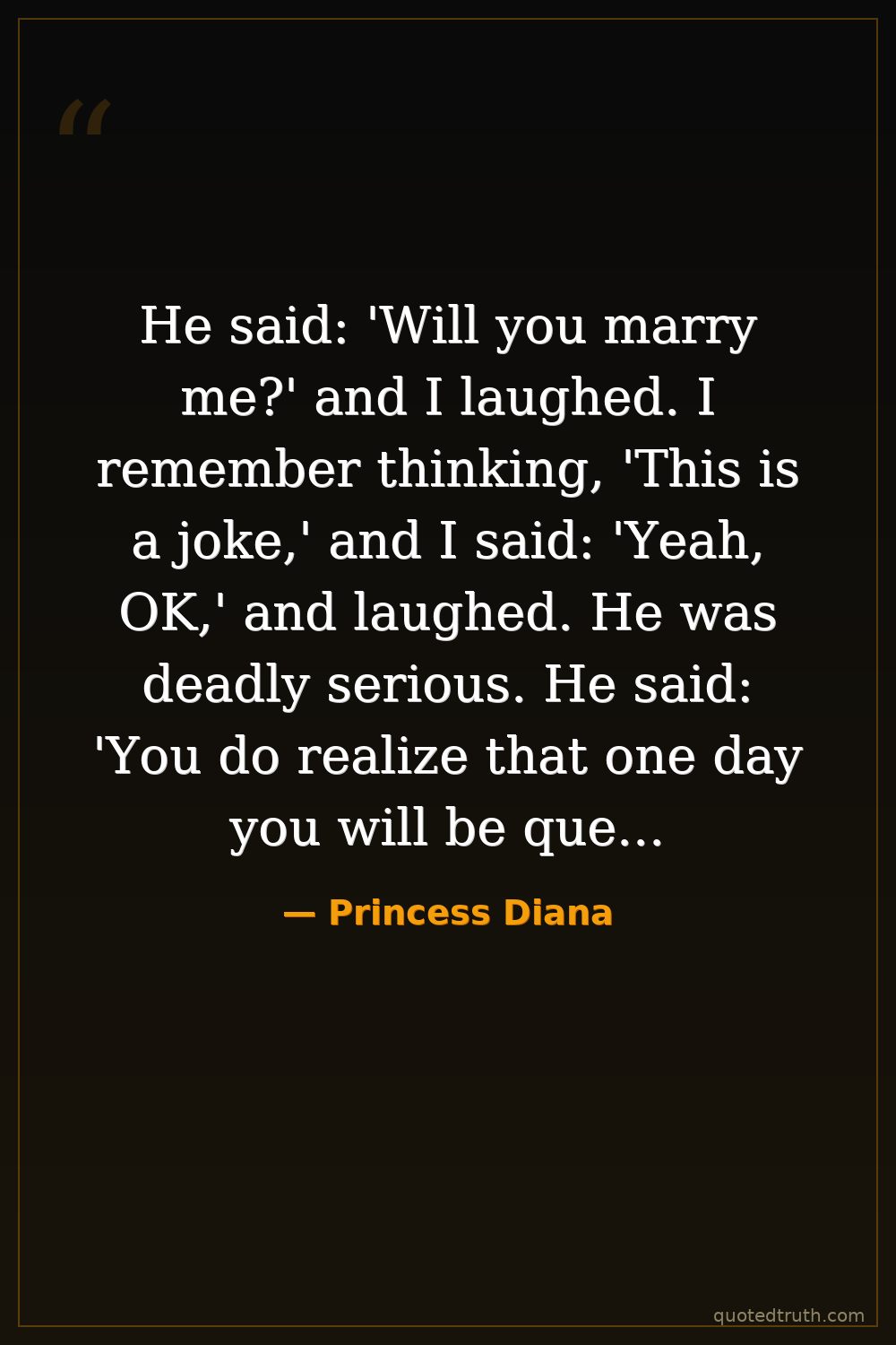 He said: 'Will you marry me?' and I laughed. I remember thinking, 'This is a joke,' and I said: 'Yeah, OK,' and laughed. He was deadly serious. He said: 'You do realize that one day you will be queen.' And a voice said to me inside: 'You won't be queen but you'll have a tough role.' So I thought 'OK,' so I said: 'Yes.' I said: 'I love you so much, I love you so much.' He said: 'Whatever love means.'