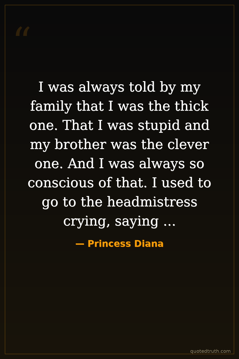 I was always told by my family that I was the thick one. That I was stupid and my brother was the clever one. And I was always so conscious of that. I used to go to the headmistress crying, saying I wish I wasn't so stupid. — Princess Diana Contemporary British royal, humanitarian