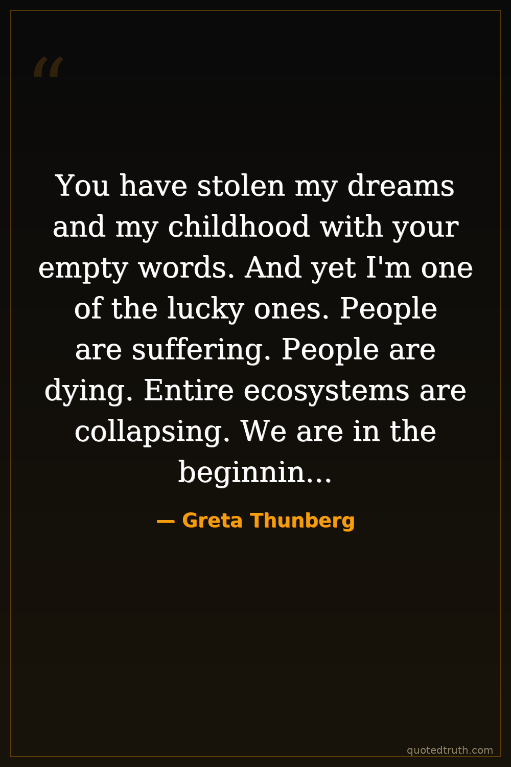 You have stolen my dreams and my childhood with your empty words. And yet I'm one of the lucky ones. People are suffering. People are dying. Entire ecosystems are collapsing. We are in the beginning of a mass extinction, and all you can talk about is money and fairy tales of eternal economic growth. How dare you!