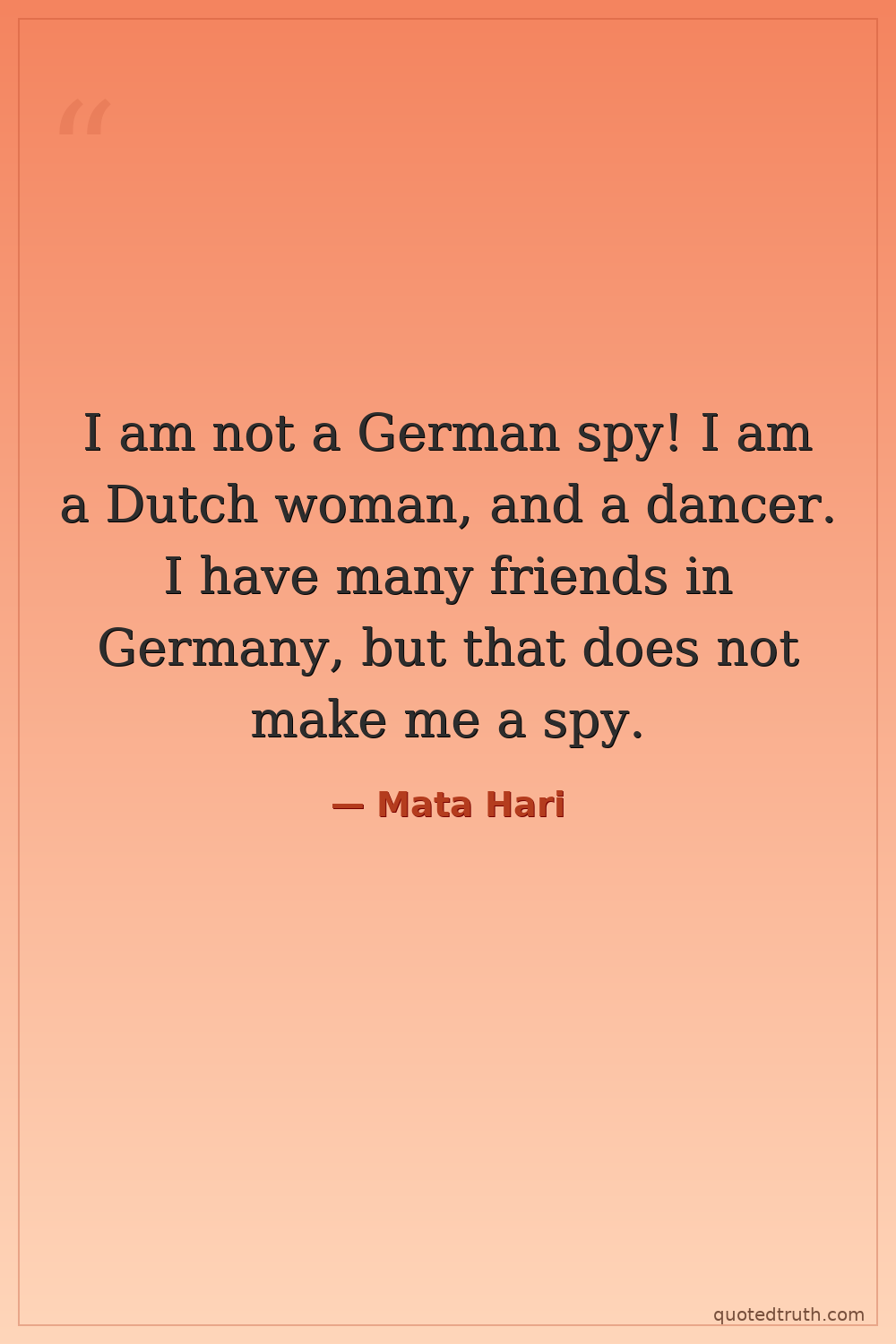 I am not a German spy! I am a Dutch woman, and a dancer. I have many friends in Germany, but that does not make me a spy.