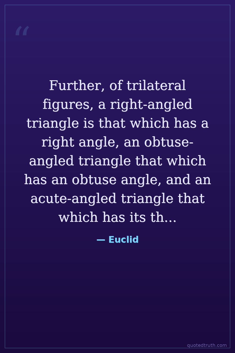 Further, of trilateral figures, a right-angled triangle is that which has a right angle, an obtuse-angled triangle that which has an obtuse angle, and an acute-angled triangle that which has its three angles acute.