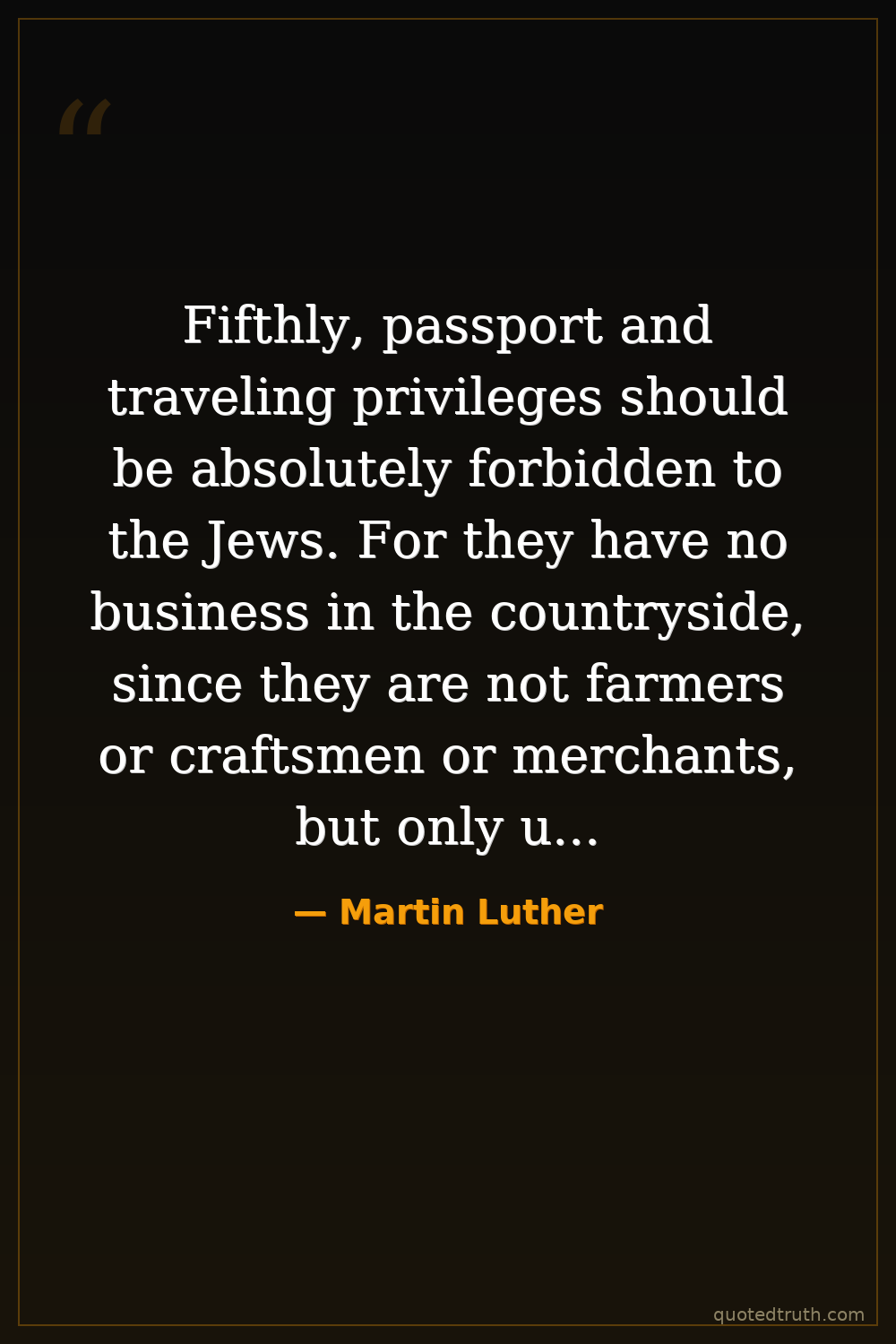 Fifthly, passport and traveling privileges should be absolutely forbidden to the Jews. For they have no business in the countryside, since they are not farmers or craftsmen or merchants, but only usurers, and they should remain at home.