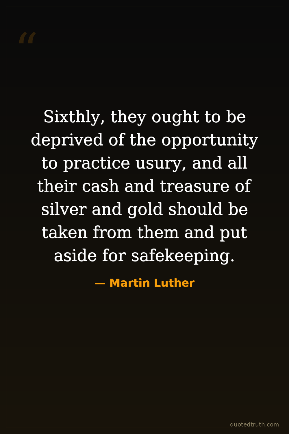 Sixthly, they ought to be deprived of the opportunity to practice usury, and all their cash and treasure of silver and gold should be taken from them and put aside for safekeeping.