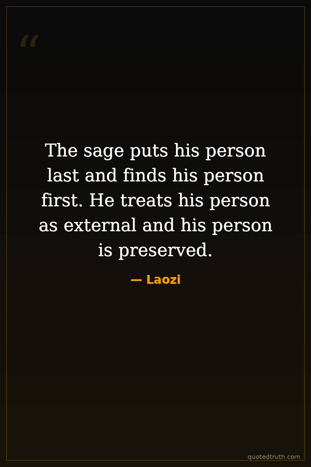 The sage puts his person last and finds his person first. He treats his person as external and his person is preserved.