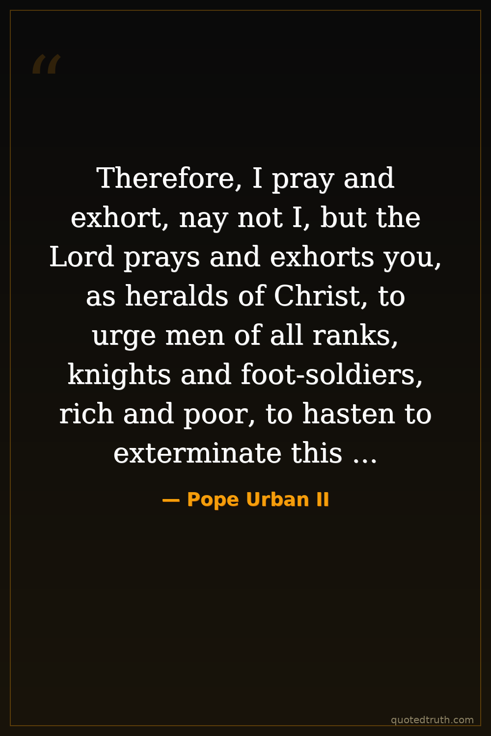 Therefore, I pray and exhort, nay not I, but the Lord prays and exhorts you, as heralds of Christ, to urge men of all ranks, knights and foot-soldiers, rich and poor, to hasten to exterminate this vile race from the lands of our brethren.