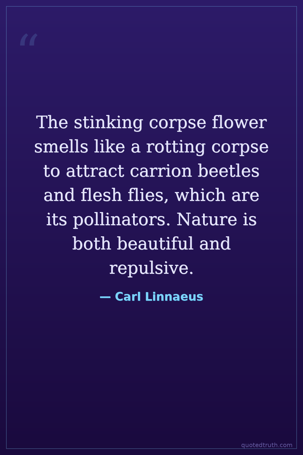 The stinking corpse flower smells like a rotting corpse to attract carrion beetles and flesh flies, which are its pollinators. Nature is both beautiful and repulsive.
