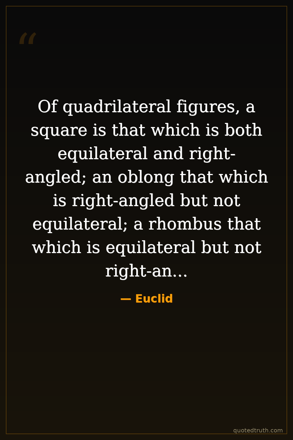 Of quadrilateral figures, a square is that which is both equilateral and right-angled; an oblong that which is right-angled but not equilateral; a rhombus that which is equilateral but not right-angled; and a rhomboid that which has its opposite sides and angles equal to one another but is neither equilateral nor right-angled. And let all other quadrilaterals besides these be called trapezia.