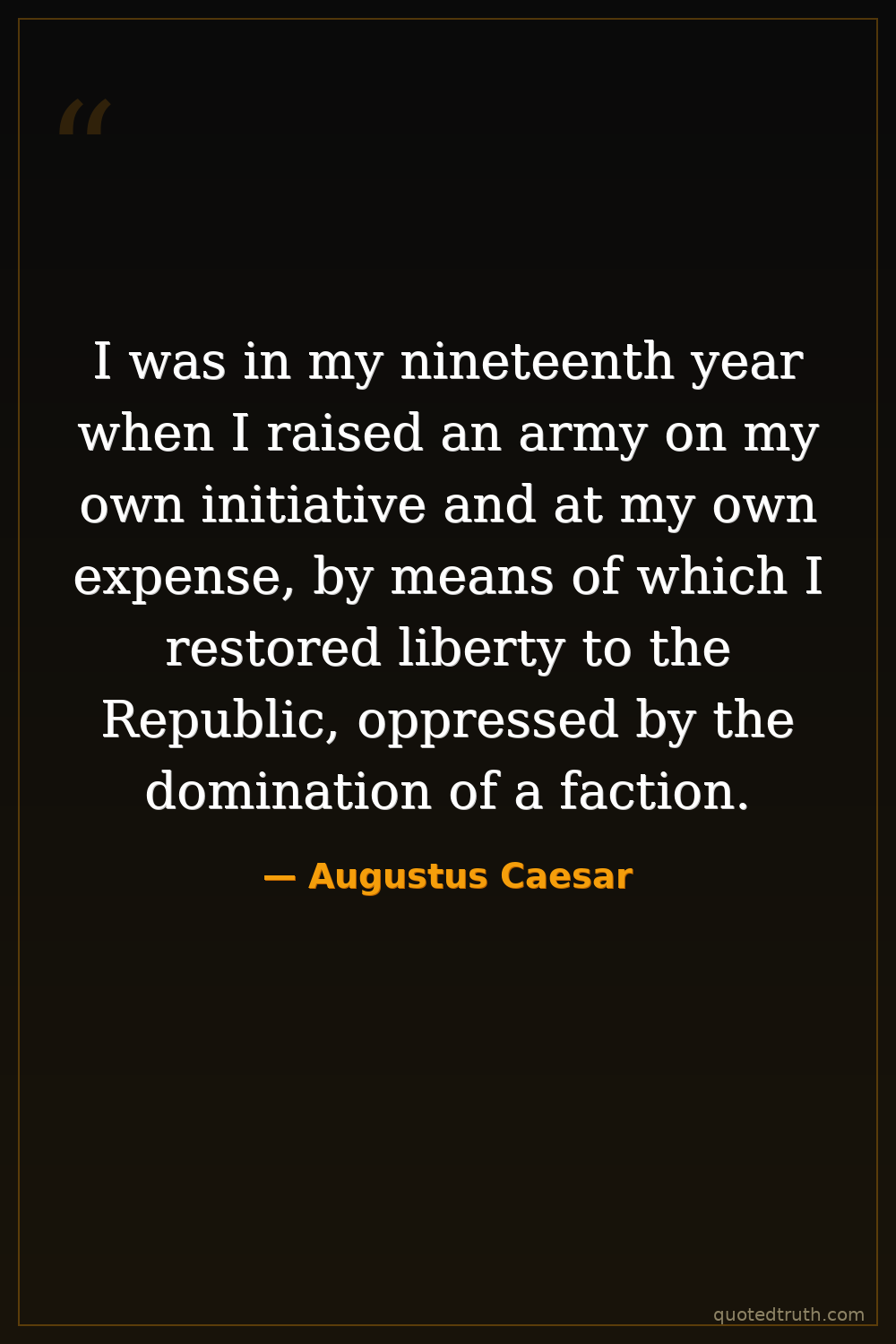 I was in my nineteenth year when I raised an army on my own initiative and at my own expense, by means of which I restored liberty to the Republic, oppressed by the domination of a faction.