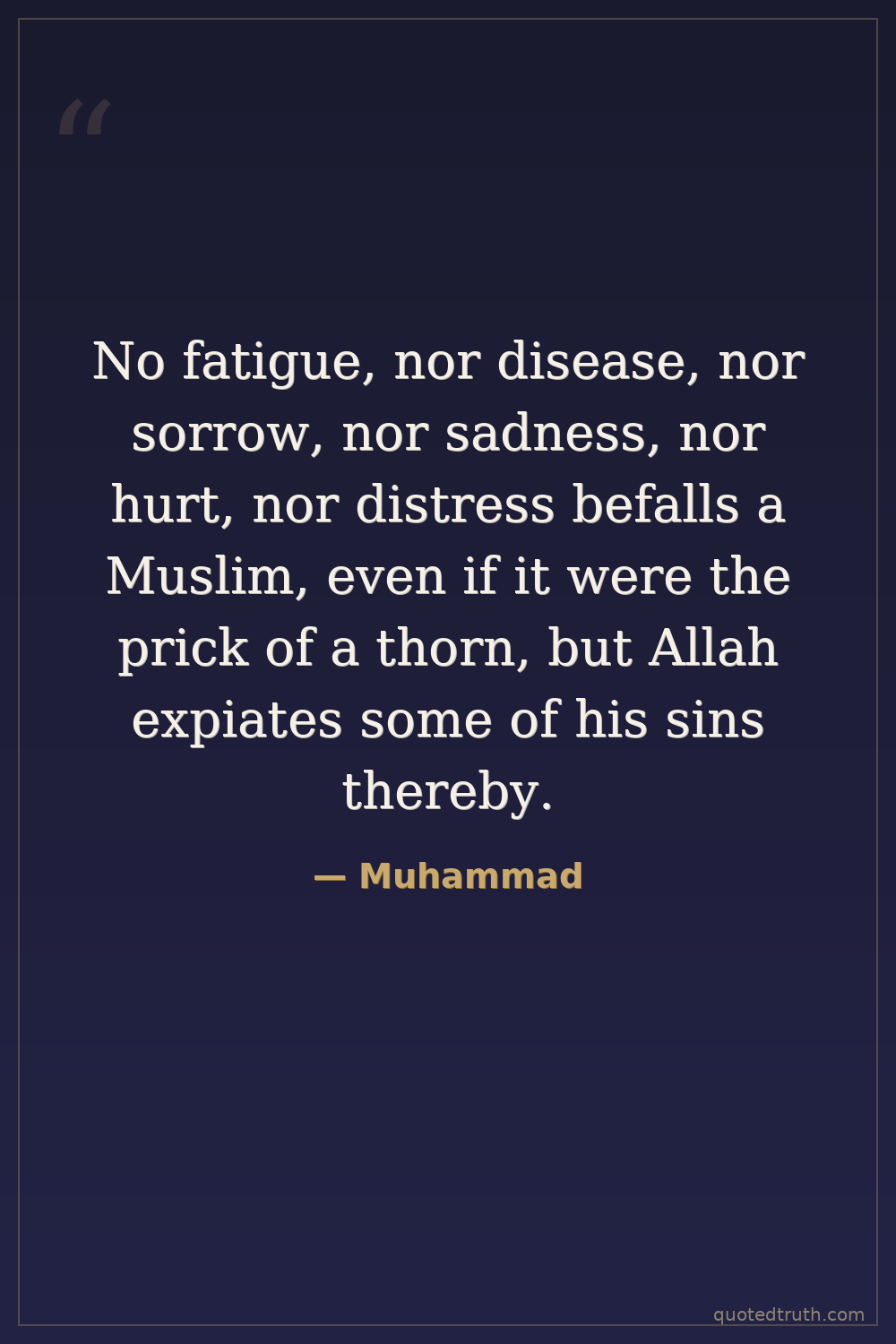 No fatigue, nor disease, nor sorrow, nor sadness, nor hurt, nor distress befalls a Muslim, even if it were the prick of a thorn, but Allah expiates some of his sins thereby.