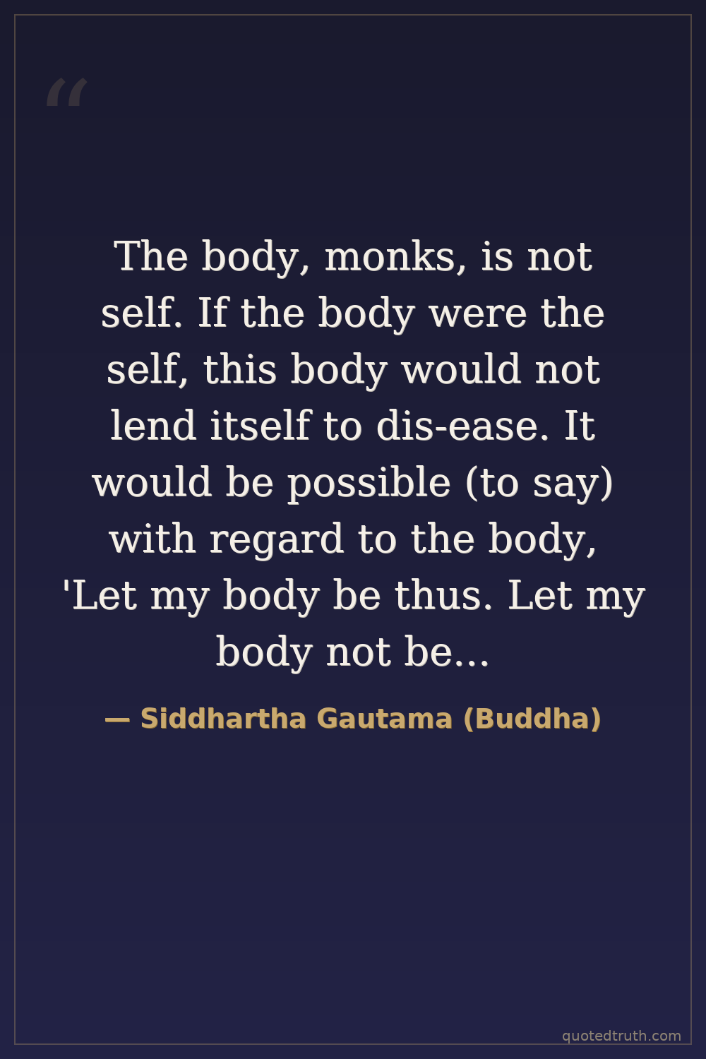 The body, monks, is not self. If the body were the self, this body would not lend itself to dis-ease. It would be possible (to say) with regard to the body, 'Let my body be thus. Let my body not be thus.' But precisely because the body is not self, the body lends itself to disease. And it is not possible (to say) with regard to the body, 'Let my body be thus. Let my body not be thus.'