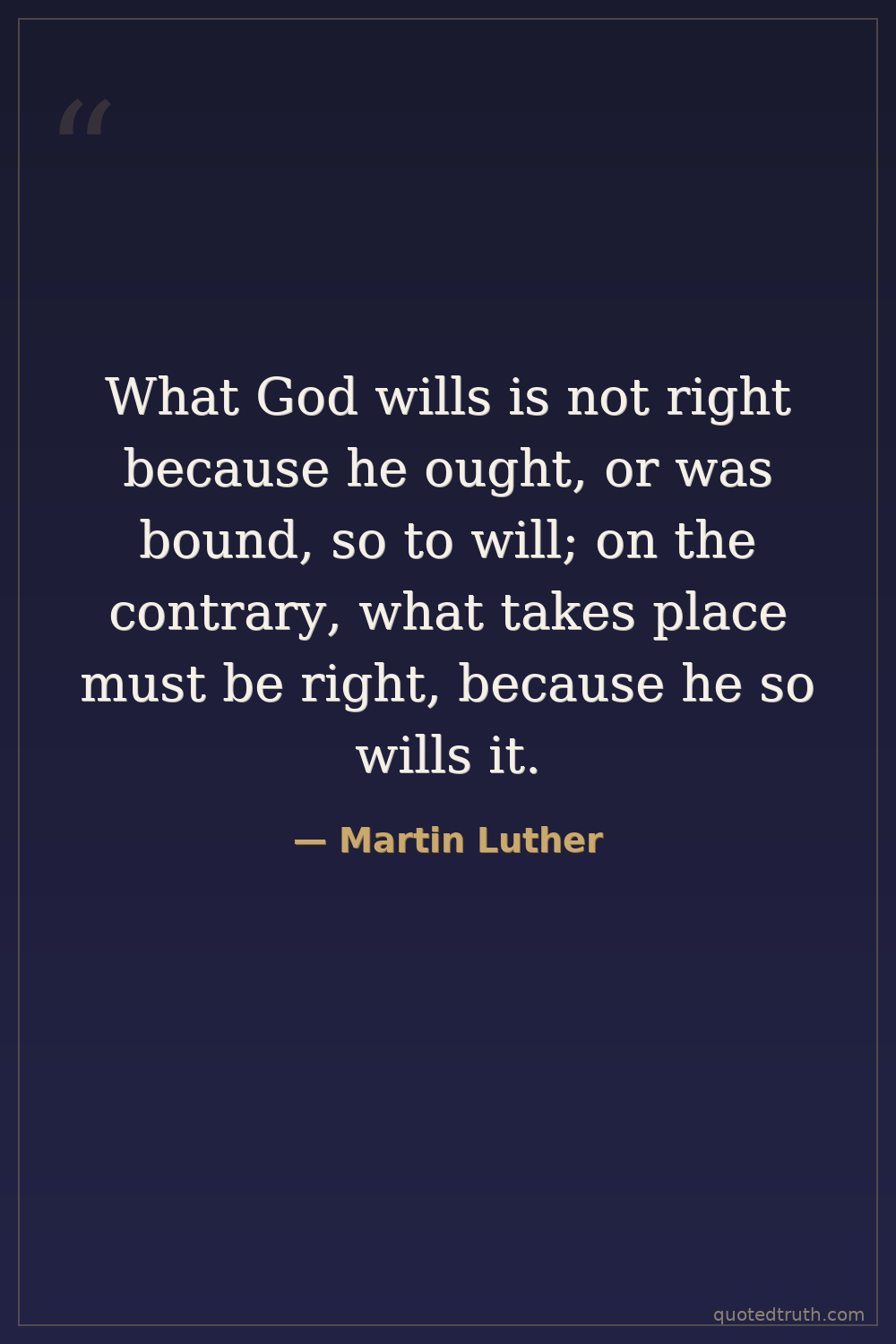 What God wills is not right because he ought, or was bound, so to will; on the contrary, what takes place must be right, because he so wills it.