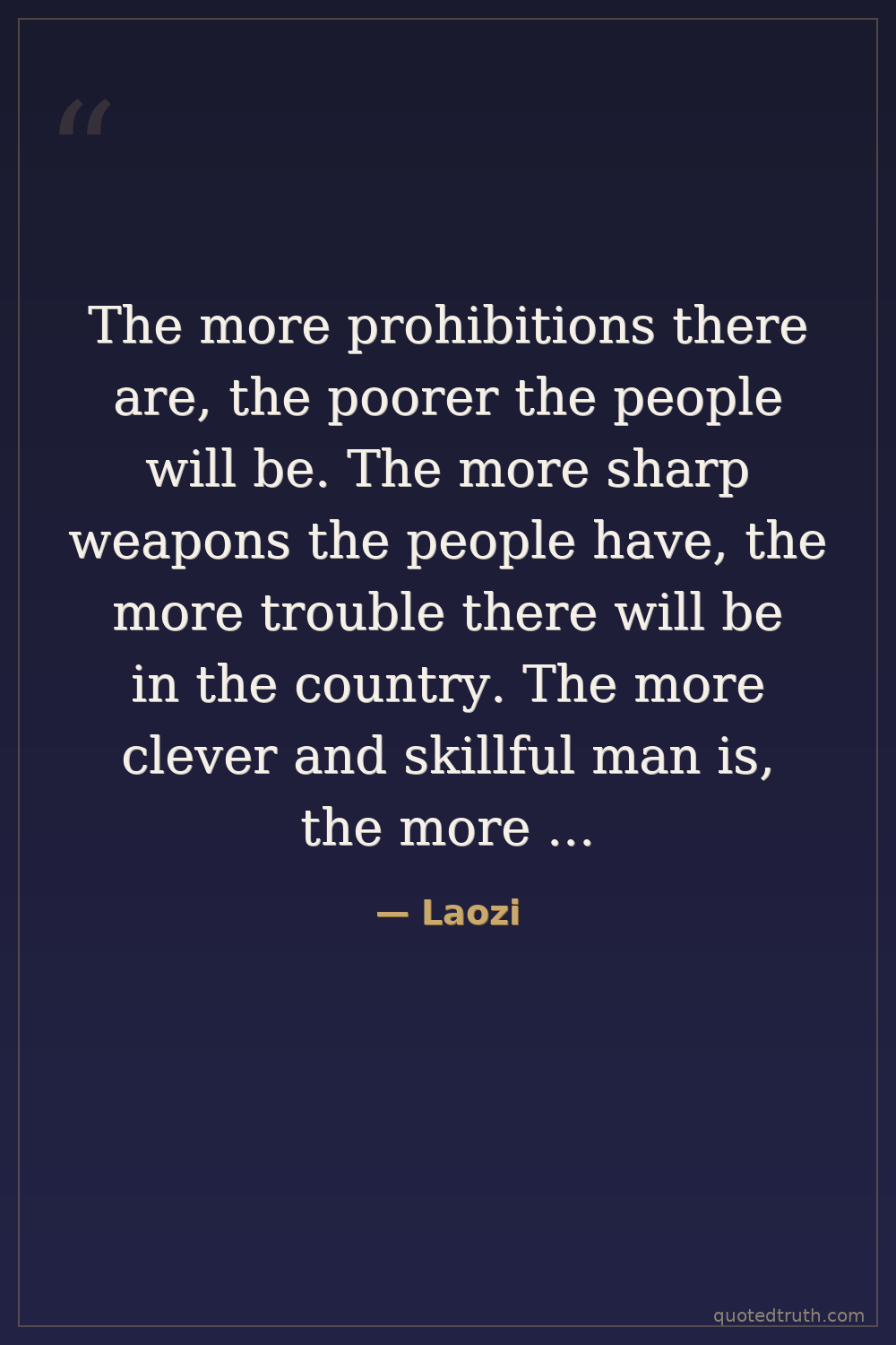 The more prohibitions there are, the poorer the people will be. The more sharp weapons the people have, the more trouble there will be in the country. The more clever and skillful man is, the more strange things will appear. The more laws are promulgated, the more thieves and bandits there will be.