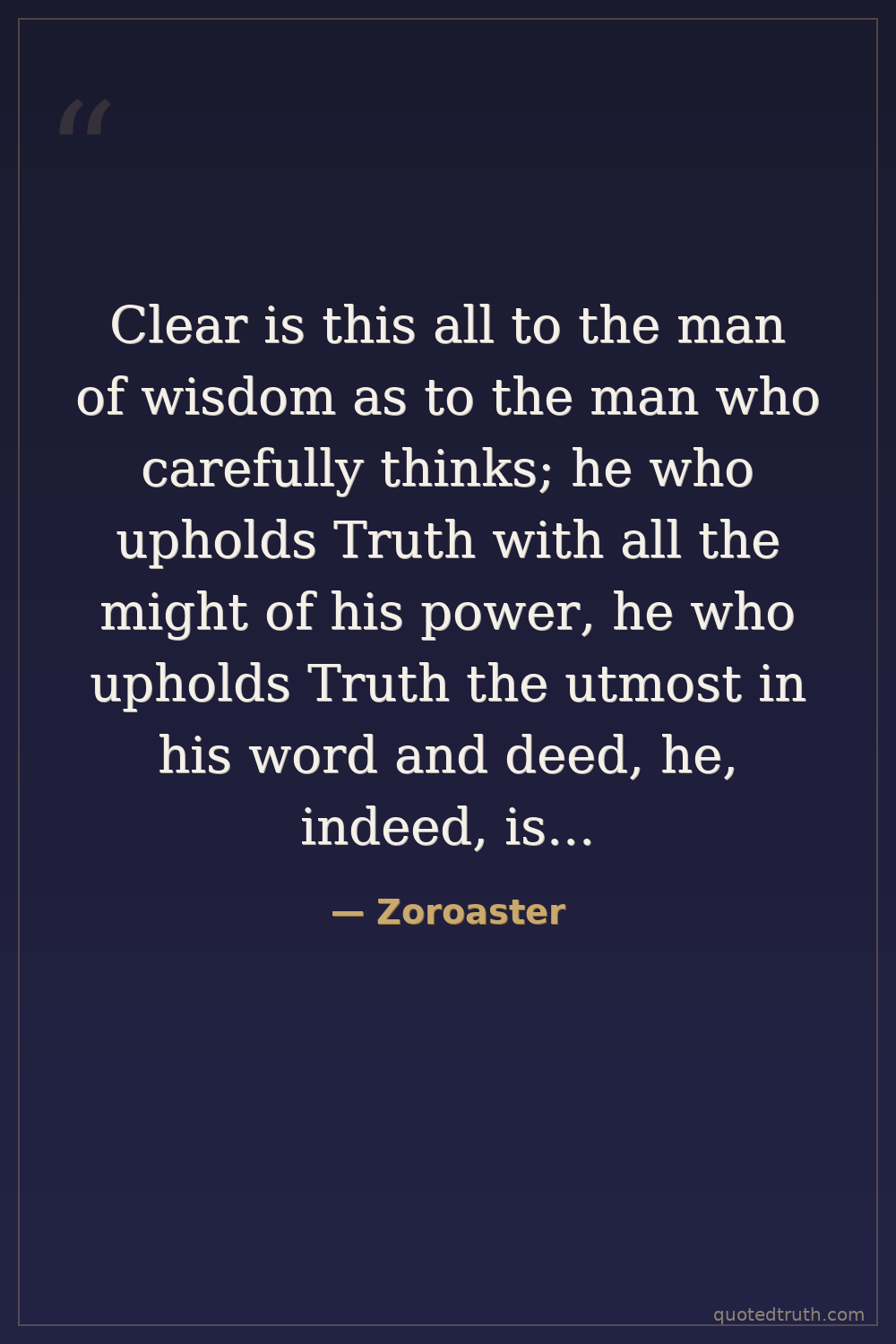 Clear is this all to the man of wisdom as to the man who carefully thinks; he who upholds Truth with all the might of his power, he who upholds Truth the utmost in his word and deed, he, indeed, is thy most valued helper, O Mazda Ahura!.