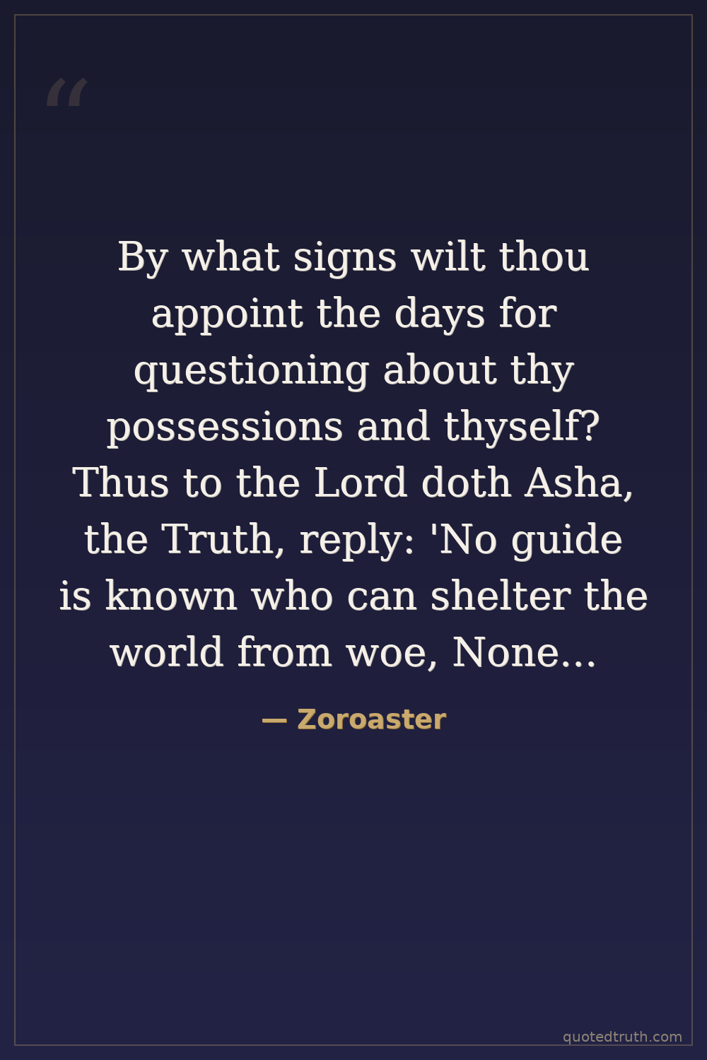 By what signs wilt thou appoint the days for questioning about thy possessions and thyself? Thus to the Lord doth Asha, the Truth, reply: 'No guide is known who can shelter the world from woe, None who knows what moves and works Thy lofty plans. The most powerful Of beings is he to whose help I shall go on an invocation.'