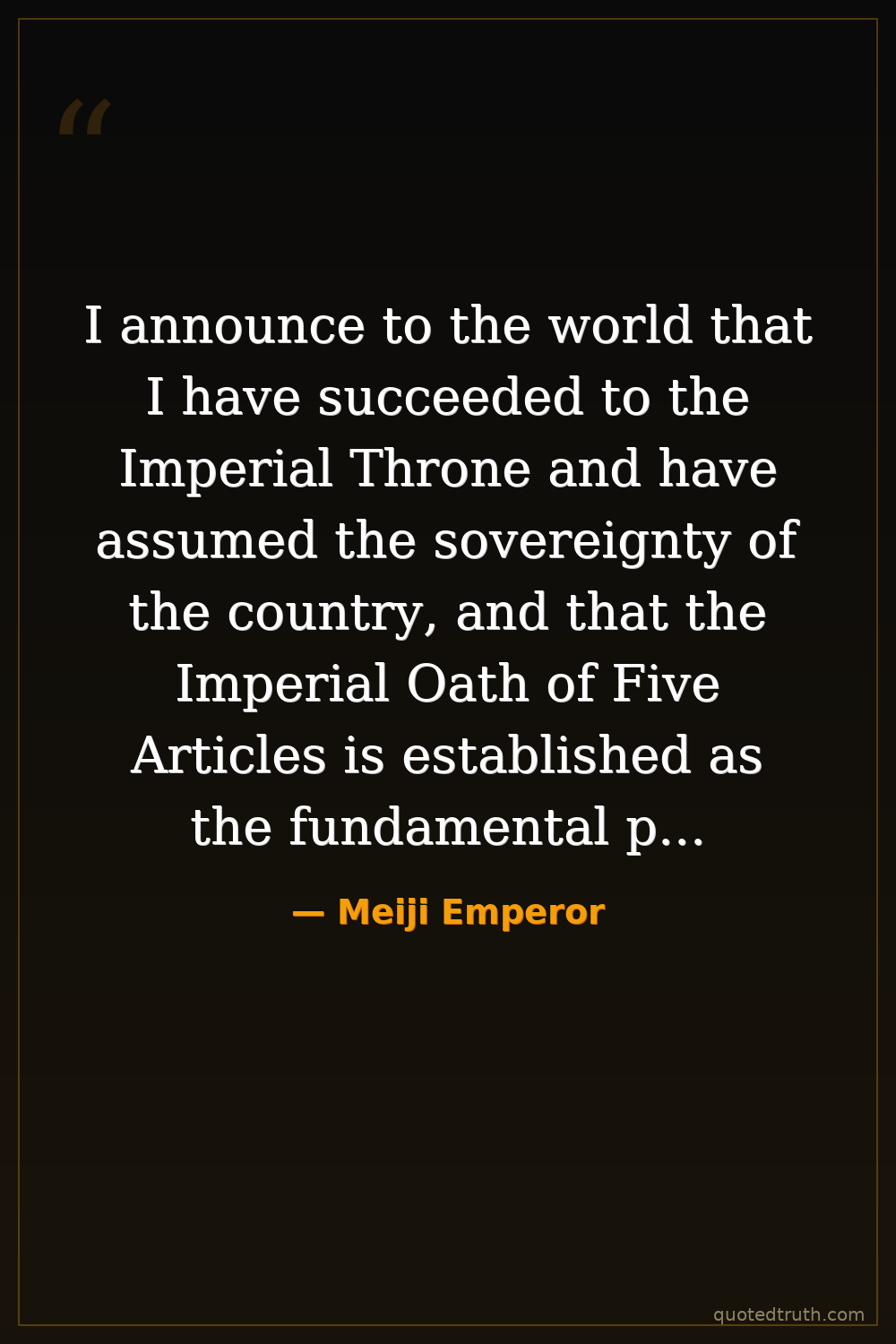 I announce to the world that I have succeeded to the Imperial Throne and have assumed the sovereignty of the country, and that the Imperial Oath of Five Articles is established as the fundamental principle of the state.
