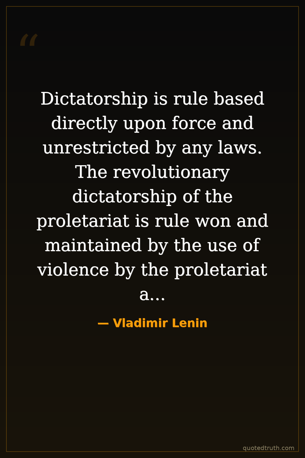 Dictatorship is rule based directly upon force and unrestricted by any laws. The revolutionary dictatorship of the proletariat is rule won and maintained by the use of violence by the proletariat against the bourgeoisie, rule that is unrestricted by any laws.