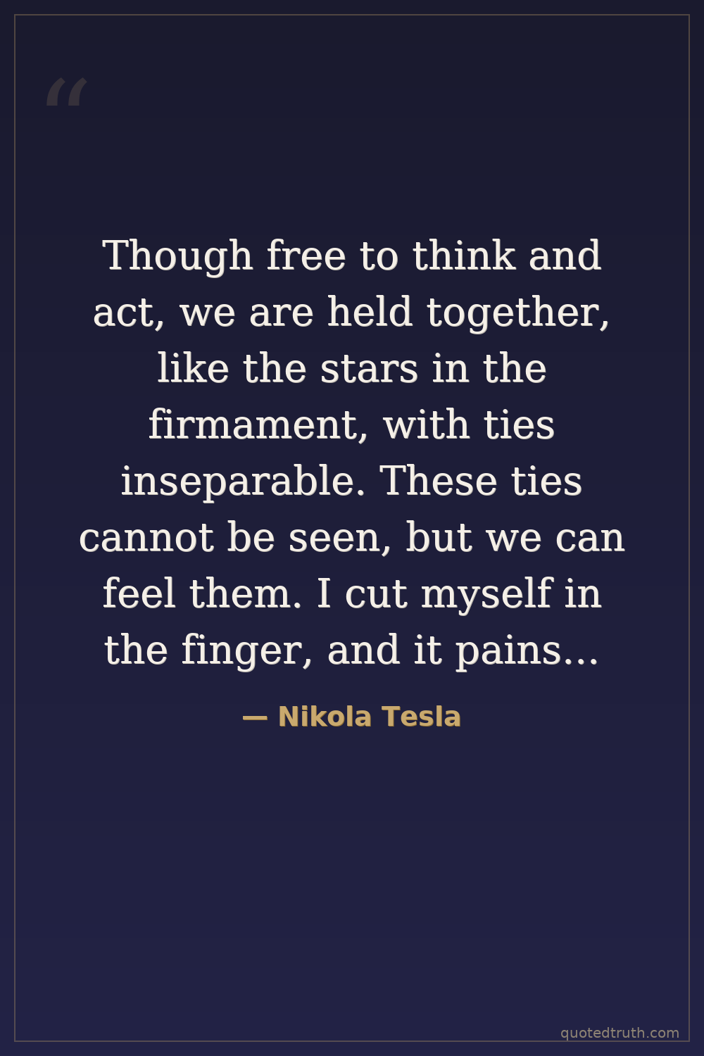 Though free to think and act, we are held together, like the stars in the firmament, with ties inseparable. These ties cannot be seen, but we can feel them. I cut myself in the finger, and it pains me: this finger is a part of me. I see a friend hurt, and it hurts me, too: my friend and I are one. And now I see stricken down an enemy, a lump of matter which, of all the lumps of matter in the universe, I care least for, and it still grieves me. Does this not prove that each of us is only part of a whole?