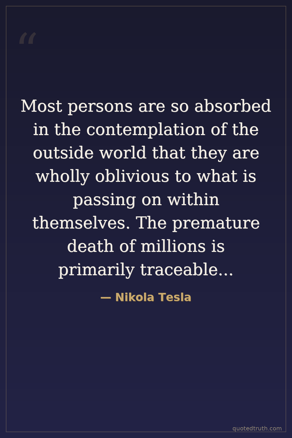 Most persons are so absorbed in the contemplation of the outside world that they are wholly oblivious to what is passing on within themselves. The premature death of millions is primarily traceable to this cause. Even among those who exercise care, it is a common mistake to avoid imaginary, and ignore the real dangers. And what is true of an individual also applies, more or less, to a people as a whole.