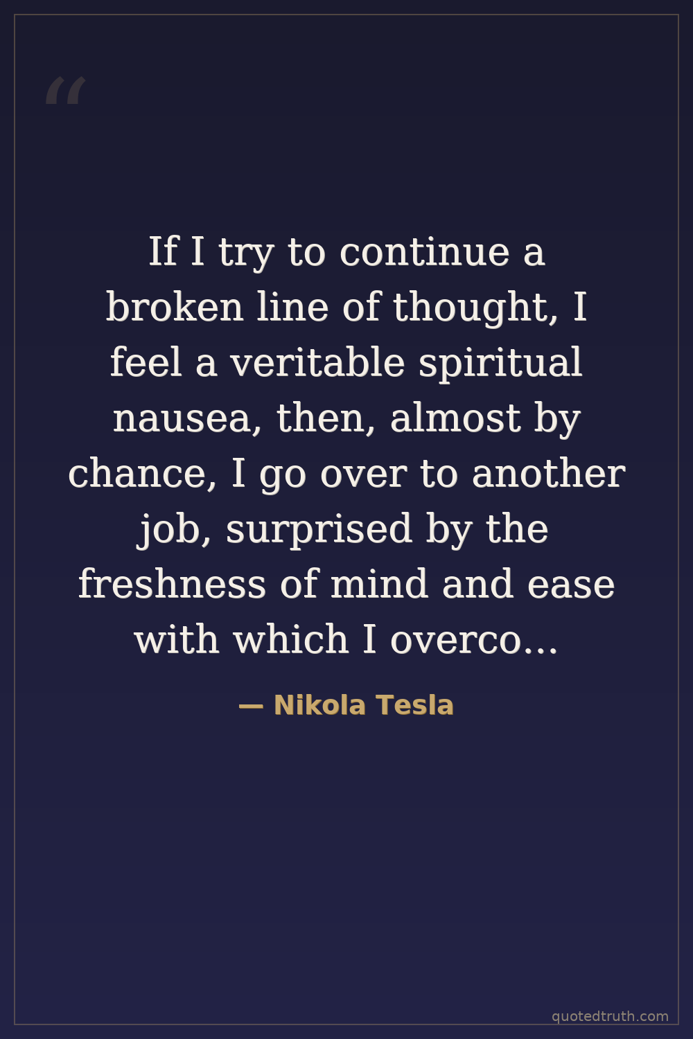 If I try to continue a broken line of thought, I feel a veritable spiritual nausea, then, almost by chance, I go over to another job, surprised by the freshness of mind and ease with which I overcome obstacles which had tormented me before. And as a rule I find answers to difficult questions with the least possible effort.