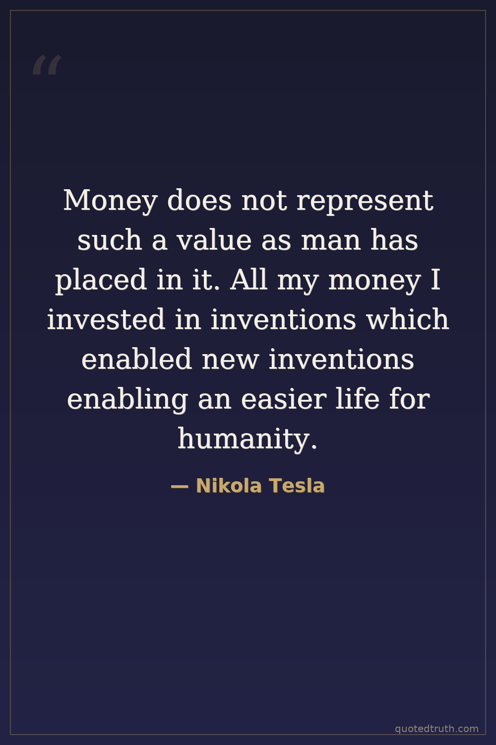 Money does not represent such a value as man has placed in it. All my money I invested in inventions which enabled new inventions enabling an easier life for humanity.