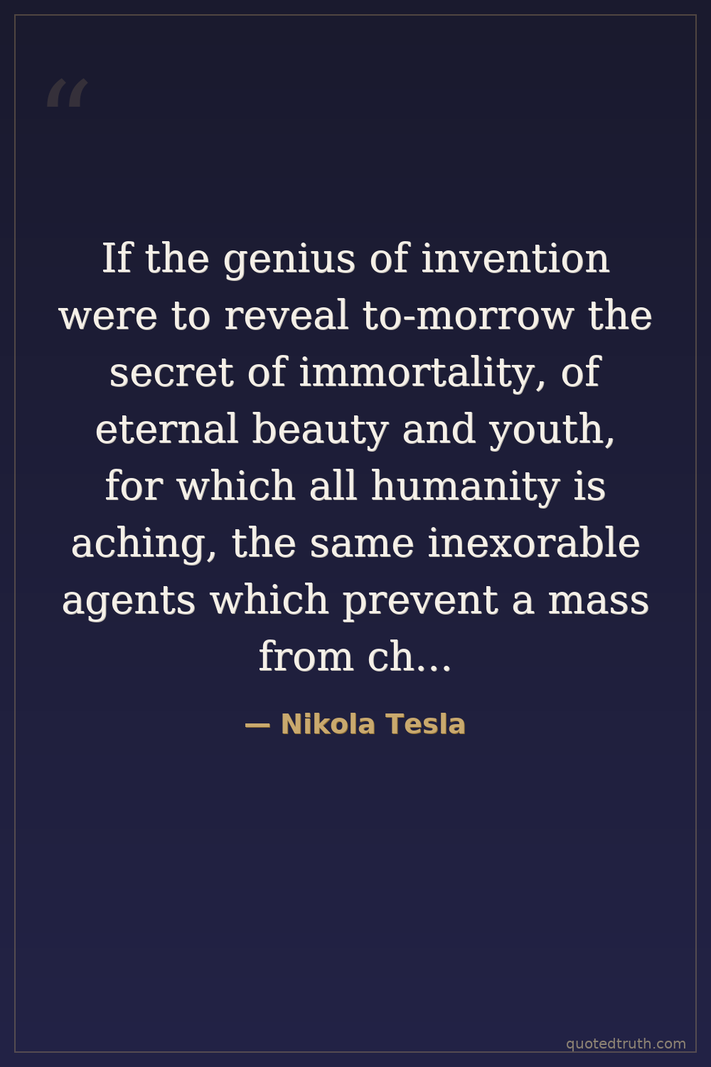 If the genius of invention were to reveal to-morrow the secret of immortality, of eternal beauty and youth, for which all humanity is aching, the same inexorable agents which prevent a mass from changing suddenly its velocity would likewise resist the force of the new knowledge until time gradually modifies human thought.