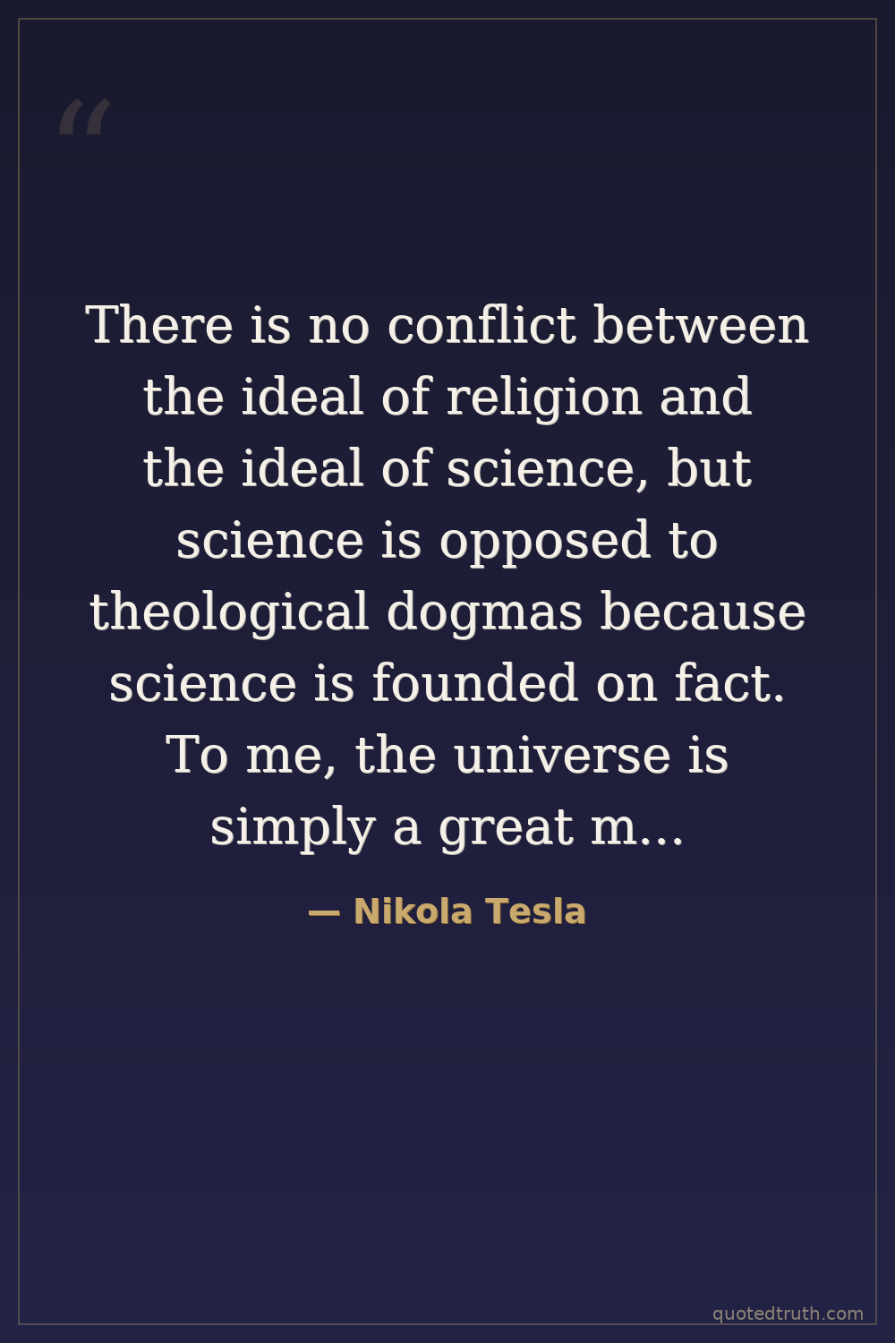 There is no conflict between the ideal of religion and the ideal of science, but science is opposed to theological dogmas because science is founded on fact. To me, the universe is simply a great machine which never came into being and never will end. The human being is no exception to the natural order. Man, like the universe, is a machine.