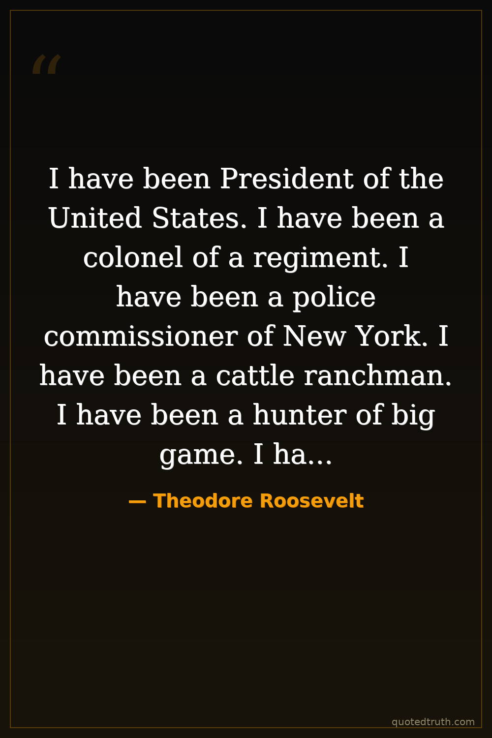 I have been President of the United States. I have been a colonel of a regiment. I have been a police commissioner of New York. I have been a cattle ranchman. I have been a hunter of big game. I have been a historian. I have been a naturalist. I have been a reformer. I have been a father. I have been a husband. I have been a man.