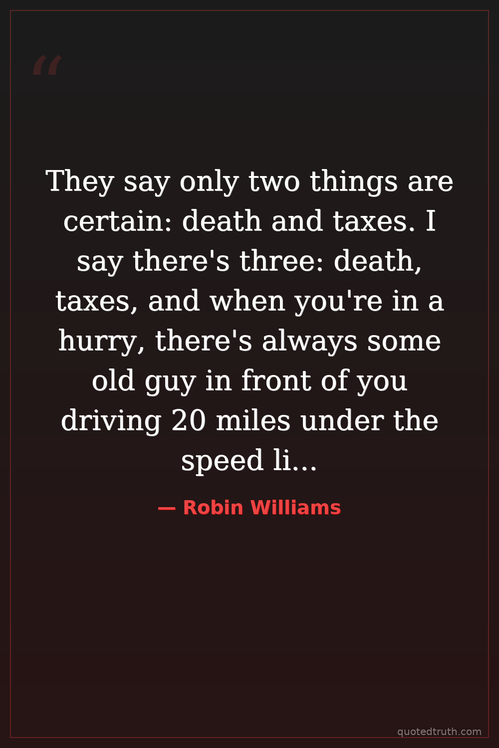 They say only two things are certain: death and taxes. I say there's three: death, taxes, and when you're in a hurry, there's always some old guy in front of you driving 20 miles under the speed limit.