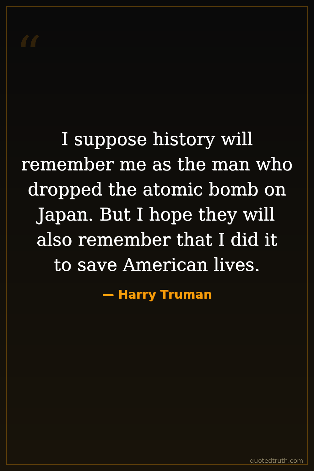 I suppose history will remember me as the man who dropped the atomic bomb on Japan. But I hope they will also remember that I did it to save American lives.