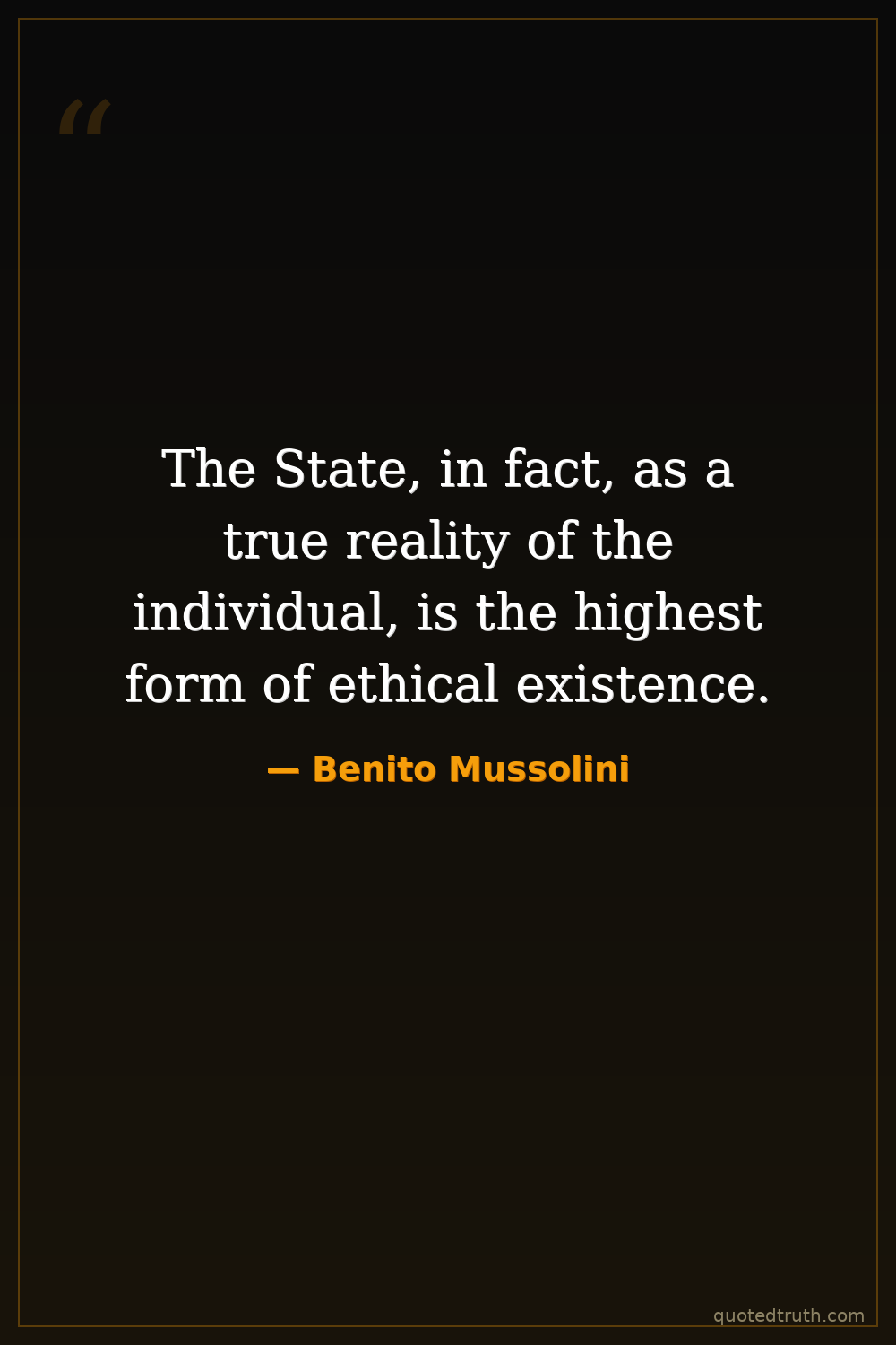 The State, in fact, as a true reality of the individual, is the highest form of ethical existence.