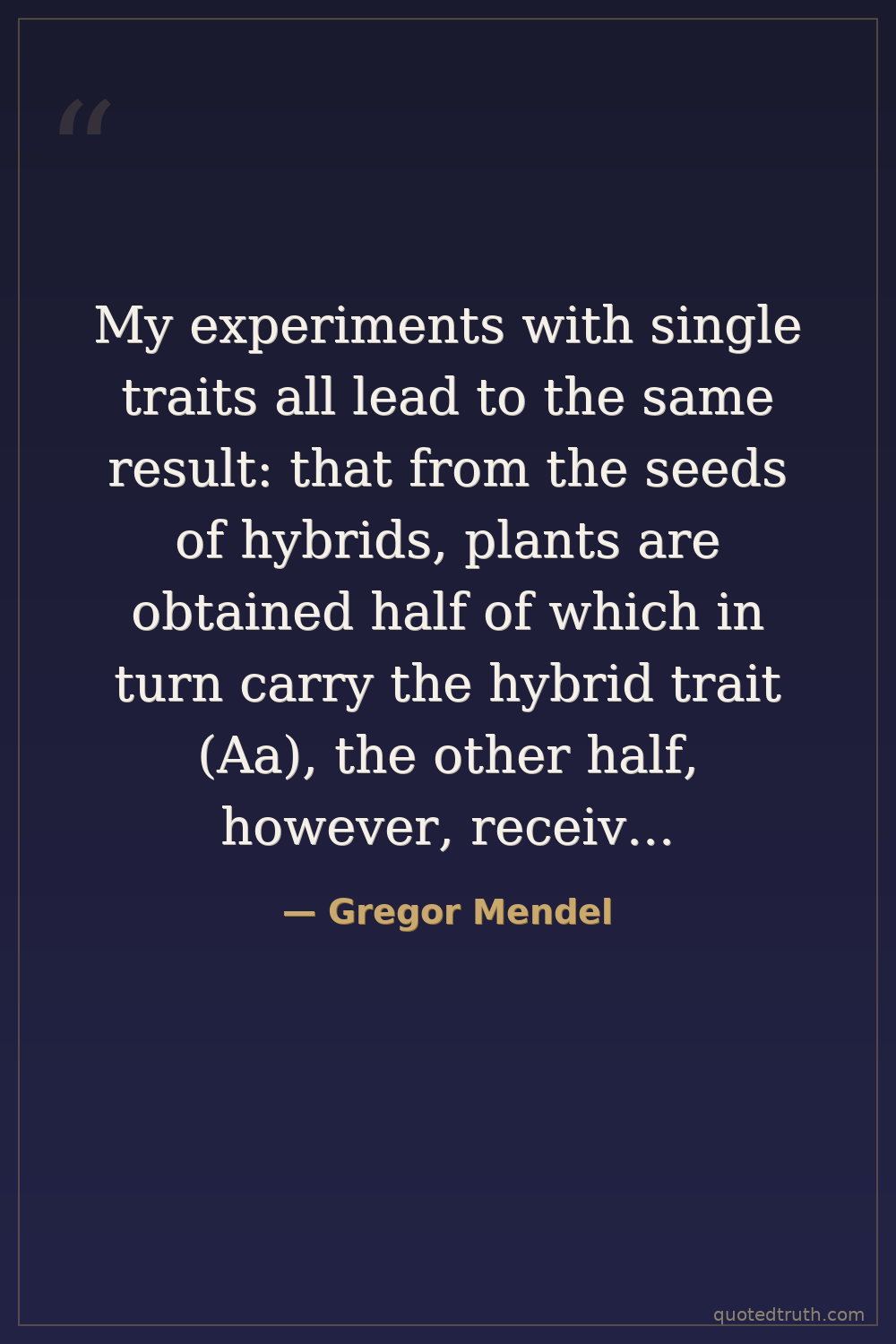 My experiments with single traits all lead to the same result: that from the seeds of hybrids, plants are obtained half of which in turn carry the hybrid trait (Aa), the other half, however, receive the parental traits A and a in equal amounts. Thus, on the average, among four plants two have the hybrid trait Aa, one the parental trait A, and the other the parental trait a. Therefore, 2Aa+ A +a or A + 2Aa + a is the empirical simple series for two differing traits.