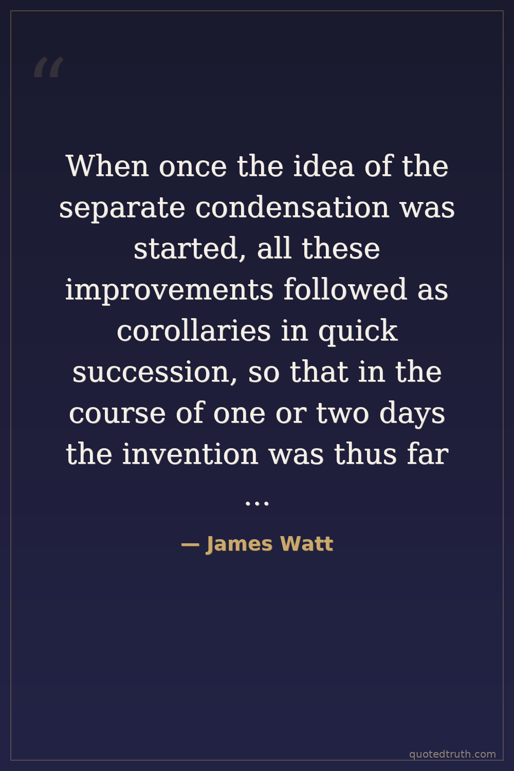 When once the idea of the separate condensation was started, all these improvements followed as corollaries in quick succession, so that in the course of one or two days the invention was thus far complete in my mind, and I immediately set about an experiment to verify it practically.